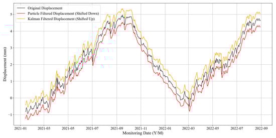 To address noise suppression in dam monitoring signals, wavelet threshold denoising [8]—noted for its multi-scale time-frequency analysis capabilities—and decomposition techniques based on intrinsic mode reconstruction [9] have been widely employed as core solutions for nonlinear signal processing. However, wavelet denoising is susceptible to signal distortion stemming from basis function selection and threshold dependency. Similarly, empirical mode decomposition (EMD) is prone to mode mixing and end effects, which undermine its stability. Although hybrid approaches leveraging their complementary strengths have been proposed [10], high computational complexity and intricate parameter tuning continue to constrain their practical engineering applicability. In contrast, Kalman filtering has gained widespread adoption for real-time data denoising owing to its dynamic updating mechanism [11]. Through state estimation and residual correction, it effectively suppresses Gaussian noise and demonstrates high accuracy in scenarios involving gradual deformations [12]. Nevertheless, a notable limitation of this algorithm is its response lag to abrupt deformations and its limited adaptability under highly complex working conditions.
