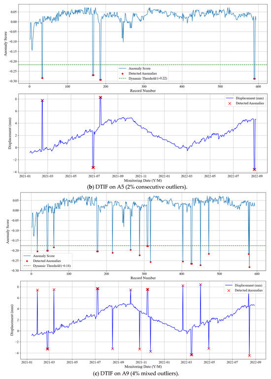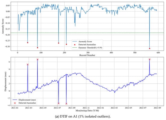 - The data-cleaning strategy combining KF and DTIF effectively removes noise and outliers from monitoring data. KF suppresses noise through recursive estimation and residual correction, while DTIF enhances anomaly detection accuracy and robustness via an adaptive threshold mechanism. Experimental results show that DTIF achieves superior detection precision across various outlier distribution scenarios, ensuring high-quality input data for subsequent prediction models.