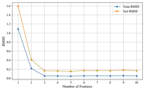 To verify the impact of factor selection on the displacement prediction model, the deformation feature factors were sequentially input into a standard RF model in order of decreasing relative importance. Specifically, the most important feature factor was first introduced for preliminary model training and testing, followed by a gradual increase in the number of feature factors until all selected factors were included. After each addition, the Root Mean Square Error (RMSE) of both the training and test sets was calculated to quantify the model’s prediction accuracy. The final results are shown in Figure 17.