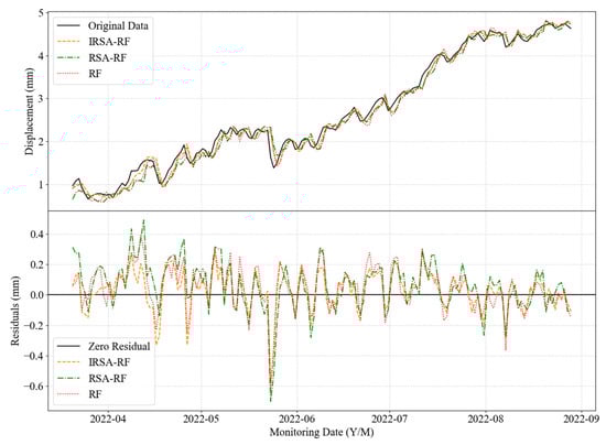 As observed in Figure 20 and Table 8, after data engineering processes including KF-DTIF data cleaning and LASSO-based feature factor screening, all three RF-based models demonstrated excellent alignment with the original displacement data, with evaluation metrics falling within highly favorable ranges. Specifically, the IRSA-RF model achieved a 1.35% and 13.21% reduction in MAE compared to RSA-RF and standard RF, respectively. Similarly, RMSE decreased by 3.43% and 13.75%, while AEmax was reduced by 13.26% and 13.84%. Additionally, both R and R2 showed slight improvements. These enhancements confirm the practical effectiveness of the IRSA-RF model in better adapting to the prediction requirements of dam displacement monitoring data. The results clearly demonstrate that the proposed IRSA optimization not only refines the hyperparameters but also significantly enhances the model’s predictive accuracy and reliability, making it more suitable for real-world dam displacement monitoring applications.
