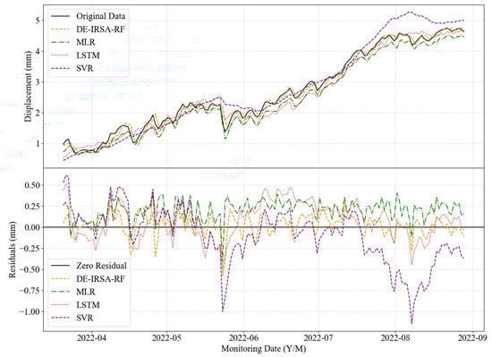 Using the dataset from monitoring point DC2, MLR, SVR, and LSTM were selected to represent traditional statistical models, classical machine learning models, and deep learning models, respectively, for comparative analysis with the proposed DE-IRSA-RF model in terms of prediction performance. The SVR model parameters were optimized through grid search, resulting in a regularization parameter c of 0.1, kernel function parameter g of 3.71, and a polynomial kernel type. The LSTM model was configured with 50 hidden neurons, the Adam optimizer, a learning rate of 0.001, 50 epochs, and a batch size of 32. Figure 21 displays the displacement time series predicted by the aforementioned models at DC2, while Table 9 presents the corresponding evaluation metrics.