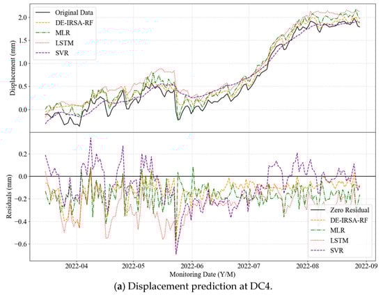 To evaluate the generalization capability of the DE-IRSA-RF model, this section compares the displacement predictions of the four models using monitoring data from points DC4 (right quarter dam beam) and DC5 (right dam abutment at the crest). For the DE-IRSA-RF model, the optimal RF hyperparameters at DC4 were Ntree = 298, MaxDepth = 9, MinSplit = 10, MinLeaf = 1, and MaxFeatures = 13, while those at DC5 were Ntree = 269, MaxDepth = 14, MinSplit = 8, MinLeaf = 2, and MaxFeatures = 8. The SVR model parameters were optimized via grid search, yielding regularization parameters c of 0.7 and 2.2 for DC4 and DC5, respectively, a kernel function parameter g of 0.01, and a linear kernel type. The LSTM hyperparameters maintained the same configuration as specified in Section 5.2. Figure 22 illustrates the displacement predictions of the four models at these points. The DE-IRSA-RF model’s predictions closely follow the actual displacement curves, with smaller residual fluctuations, demonstrating superior anti-interference and generalization capabilities. In contrast, the SVR model fails to capture sufficient displacement information at DC4, producing overly smooth predictions, while exhibiting significant deviation in the latter half of DC5 predictions, indicating poor generalization. Table 10 summarizes the corresponding evaluation metrics.