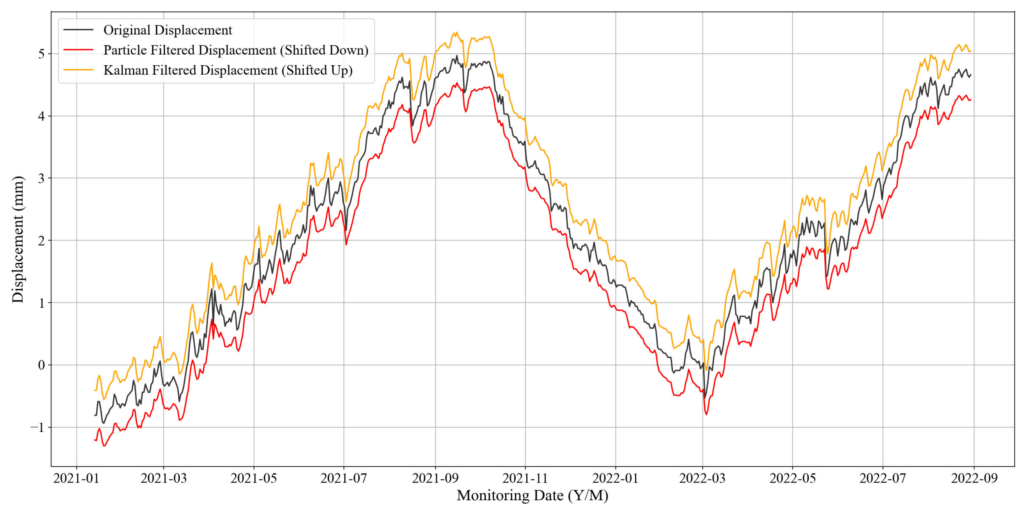 | Statistical Indicators | Original Displacement Data | KF Denoised Data | PF Denoised Data |