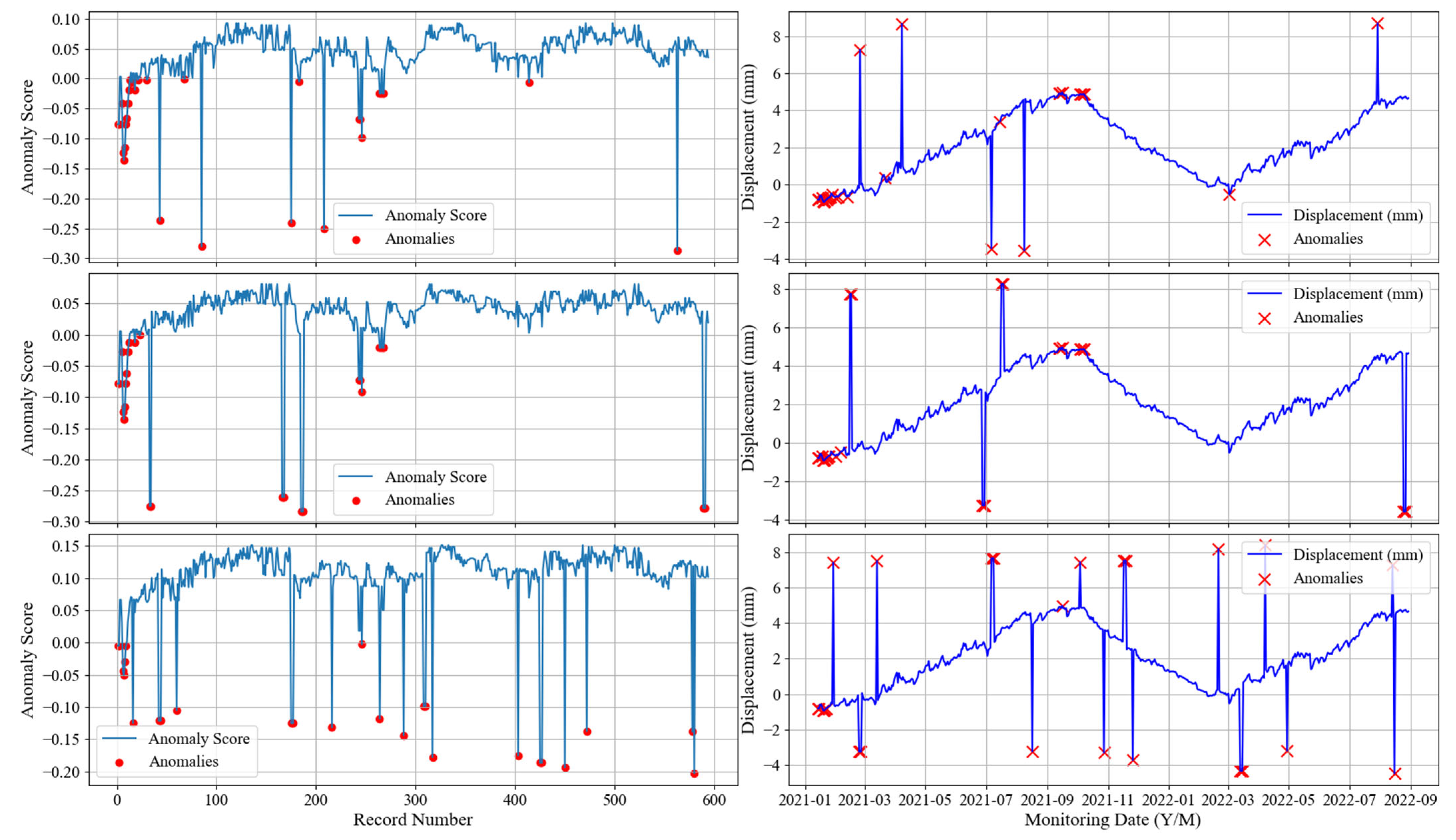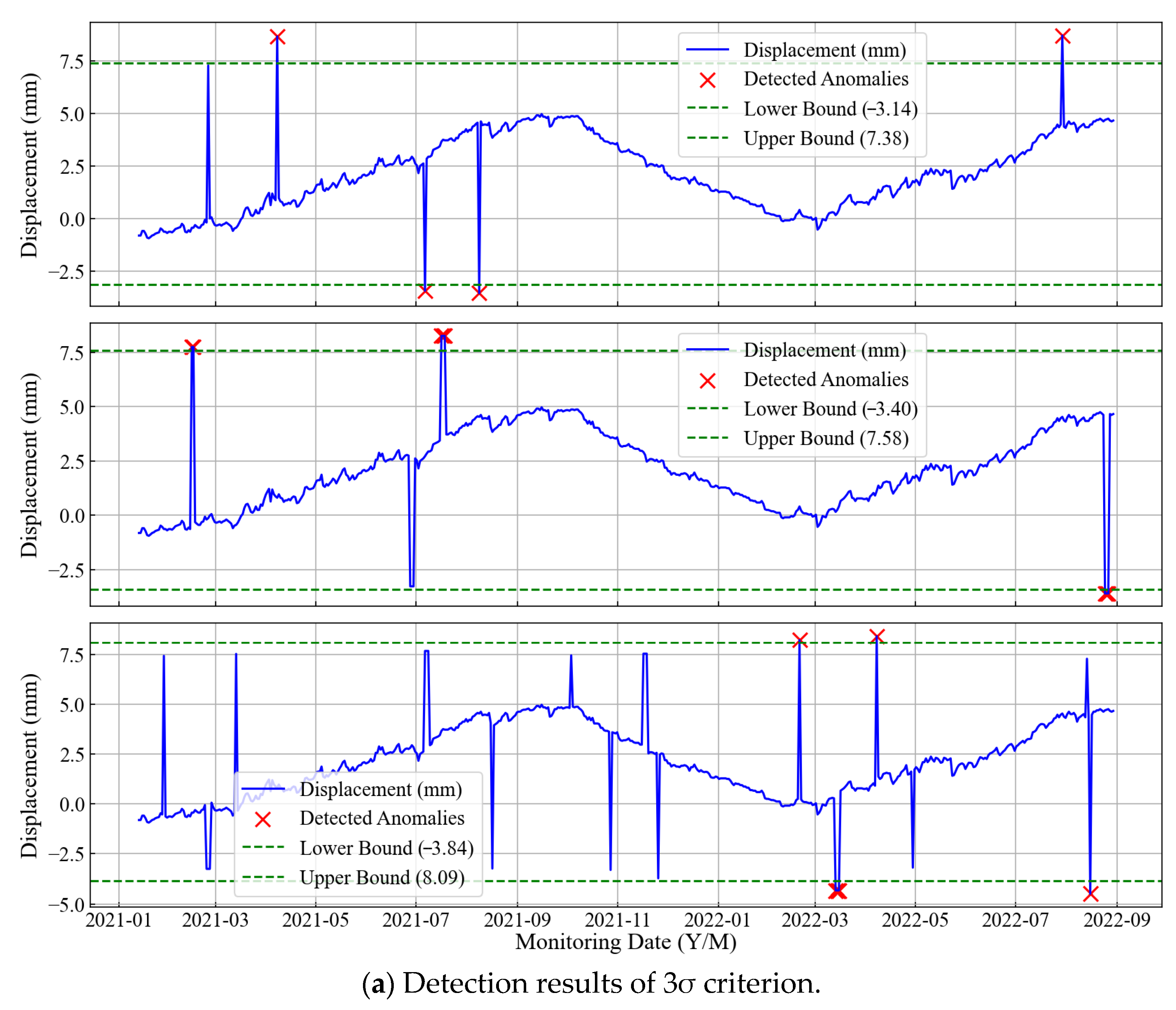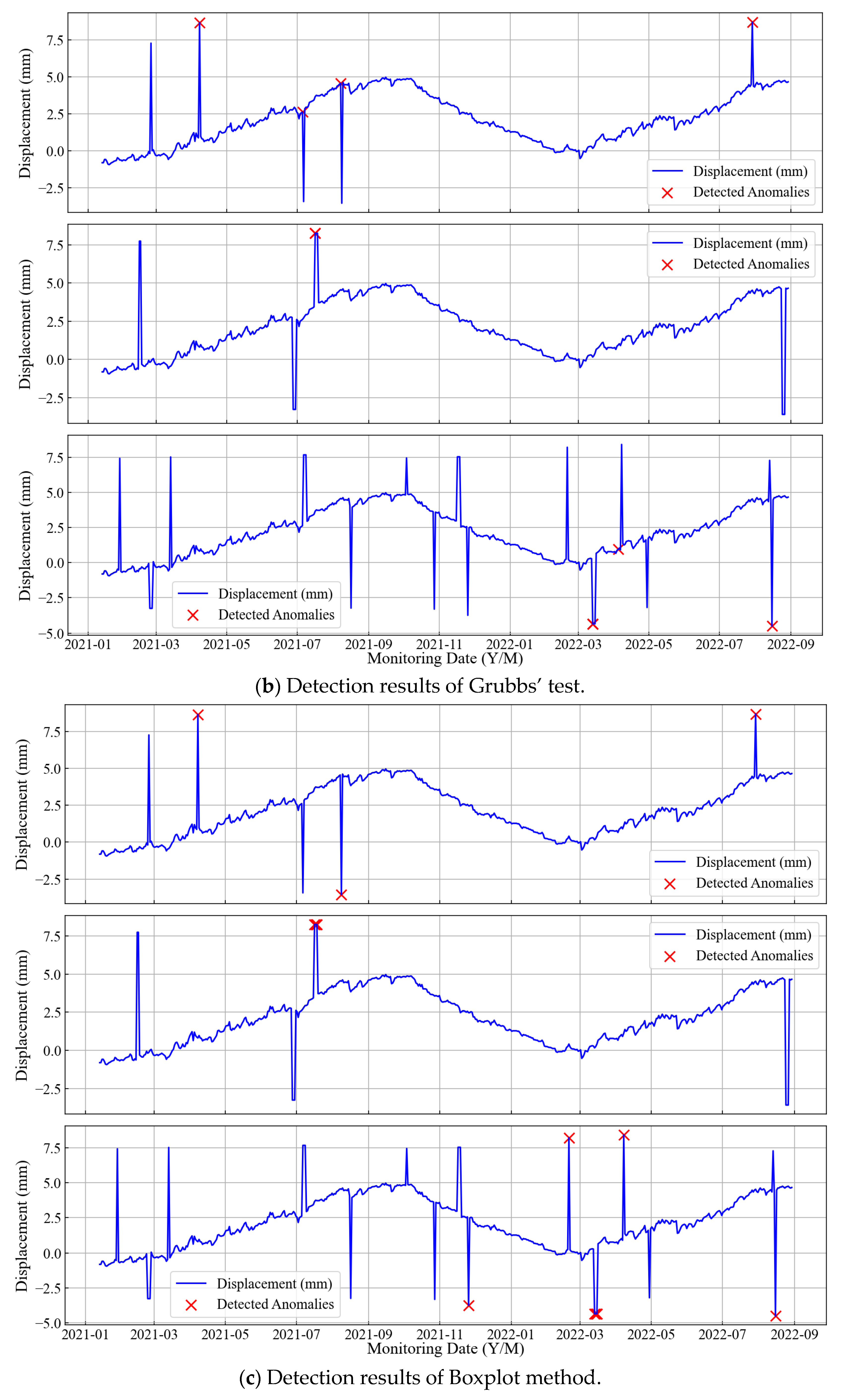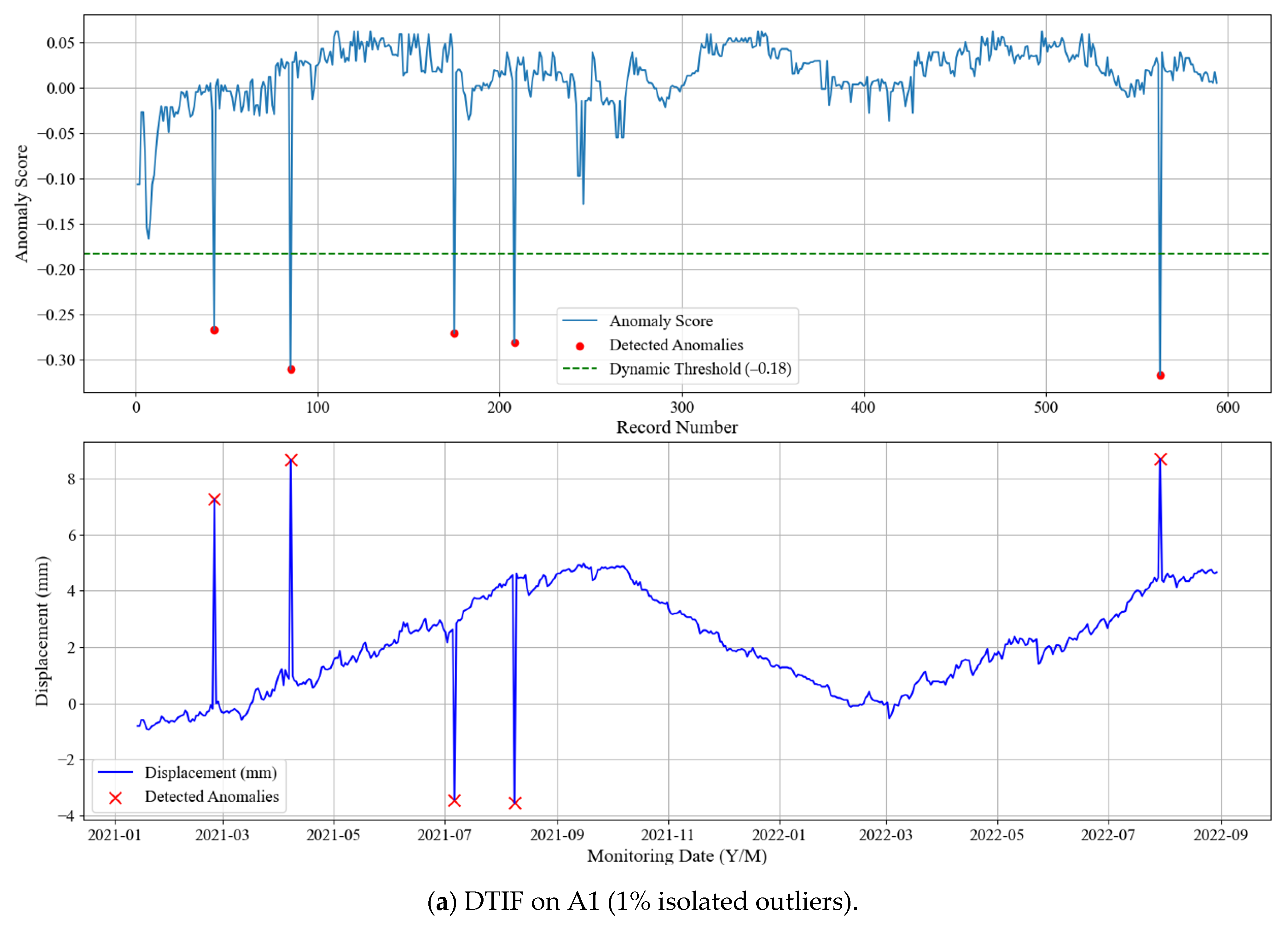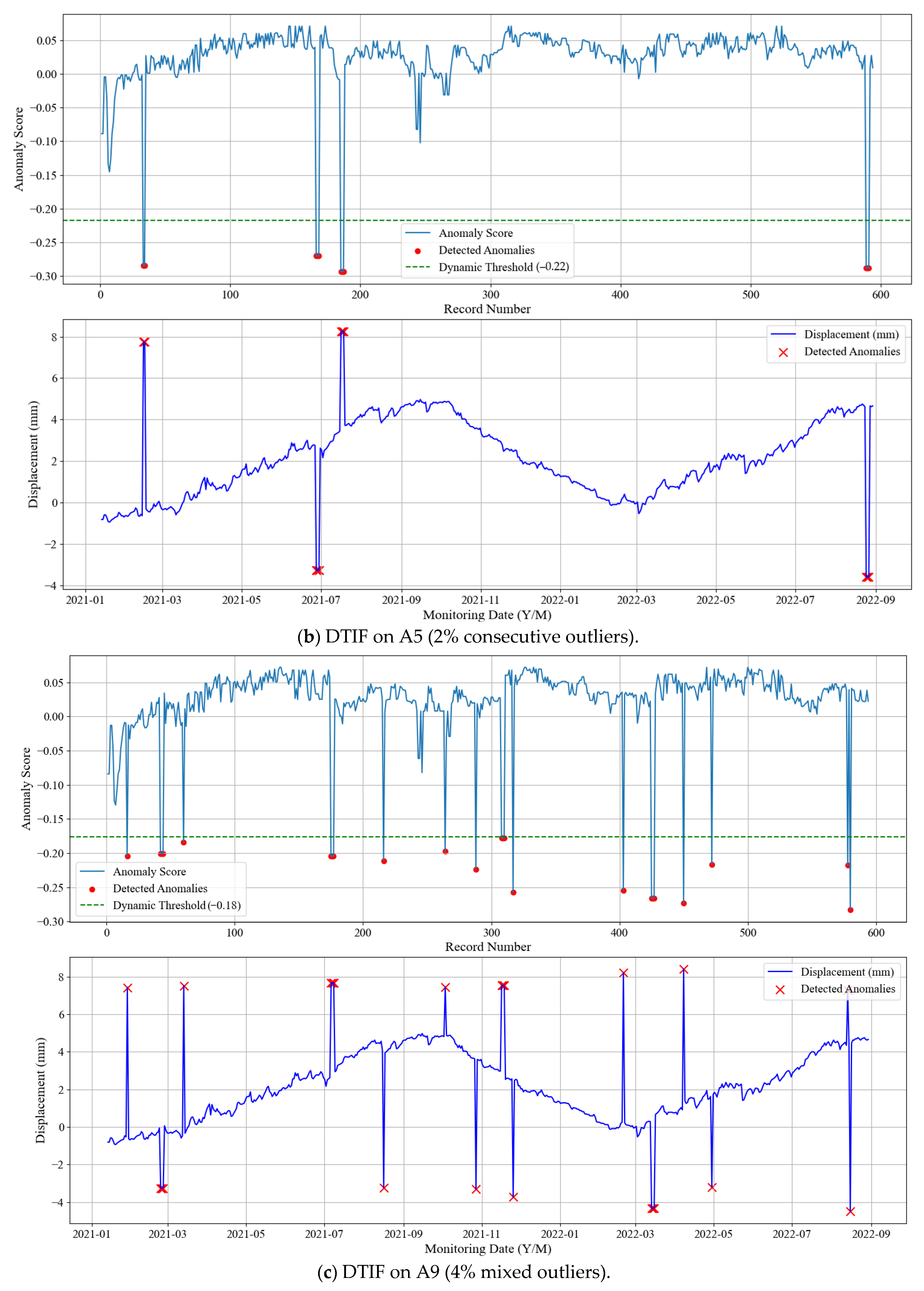 - The data-cleaning strategy combining KF and DTIF effectively removes noise and outliers from monitoring data. KF suppresses noise through recursive estimation and residual correction, while DTIF enhances anomaly detection accuracy and robustness via an adaptive threshold mechanism. Experimental results show that DTIF achieves superior detection precision across various outlier distribution scenarios, ensuring high-quality input data for subsequent prediction models.