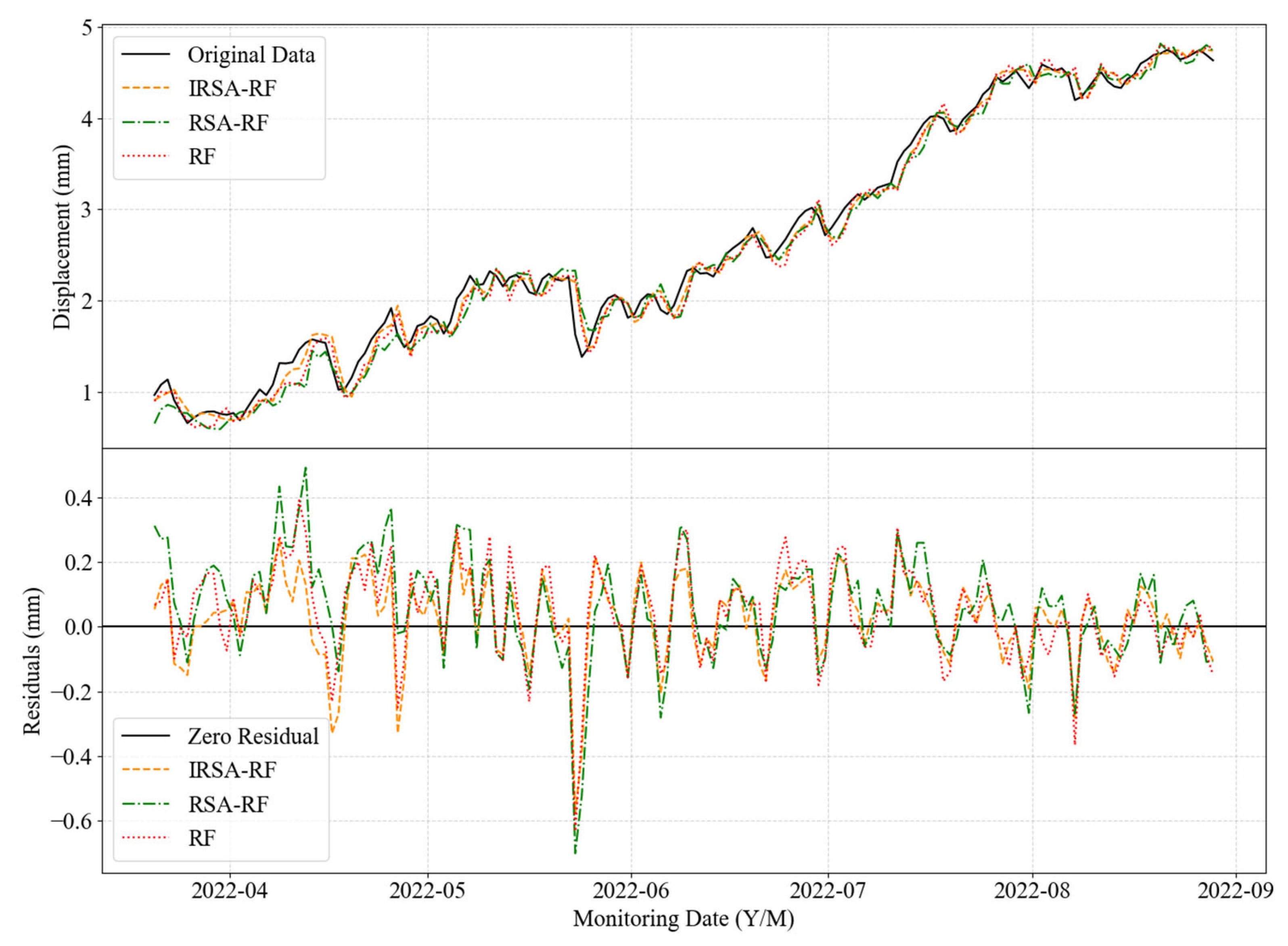 - The IRSA enhances the standard RSA by incorporating Tent chaotic mapping, dynamic parameters, Lévy flight strategy, and EOBL, thereby improving global search capability and local exploitation precision while avoiding premature convergence and local optima. A comparison between RF and RSA-RF demonstrates that the IRSA-RF model significantly reduces prediction errors in long-term displacement forecasting tasks.