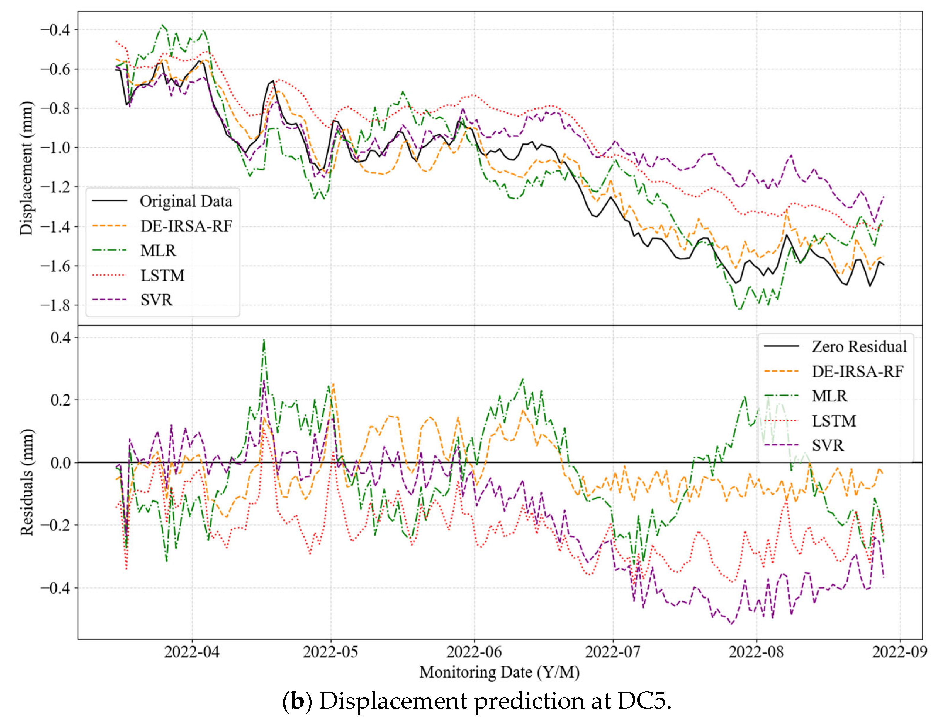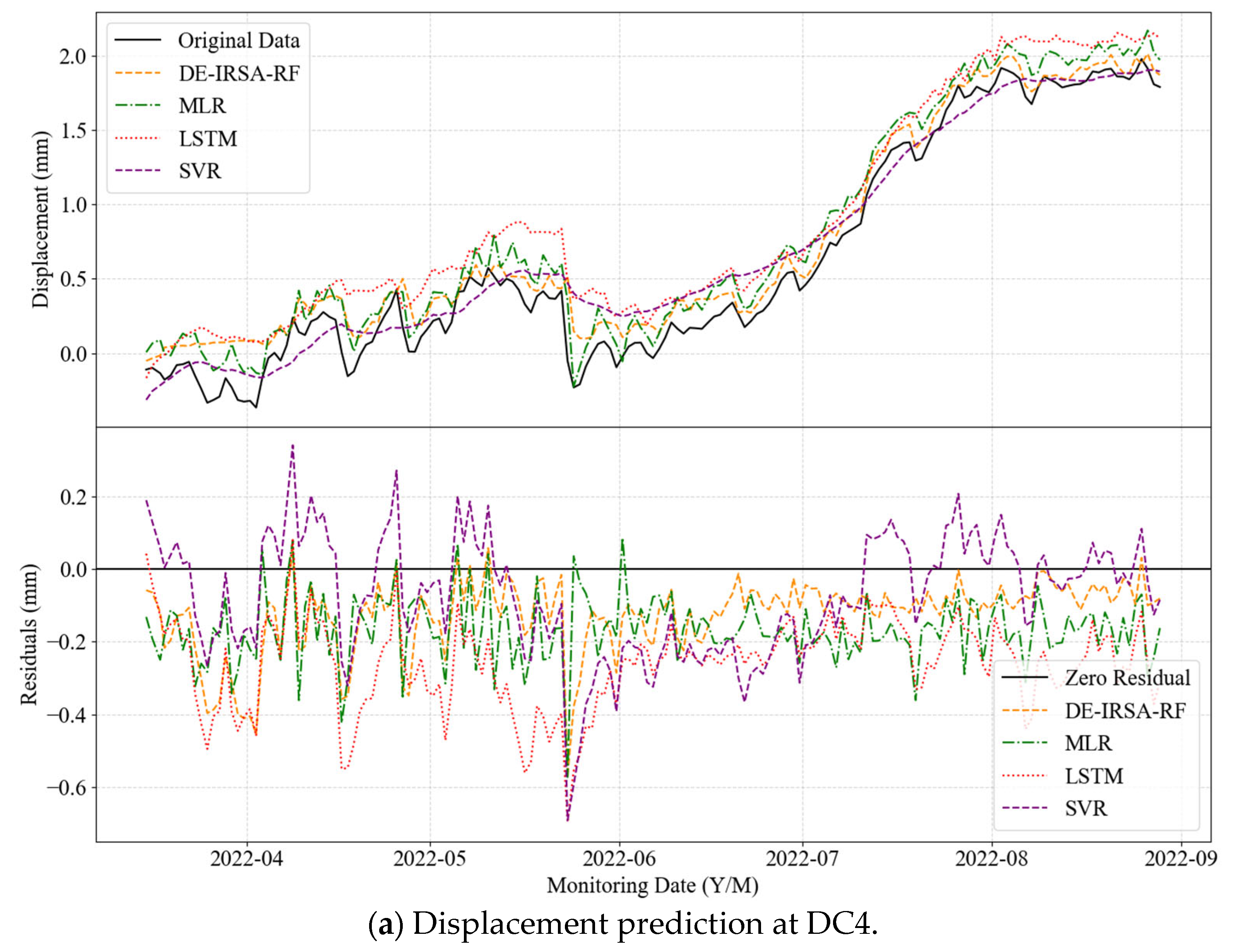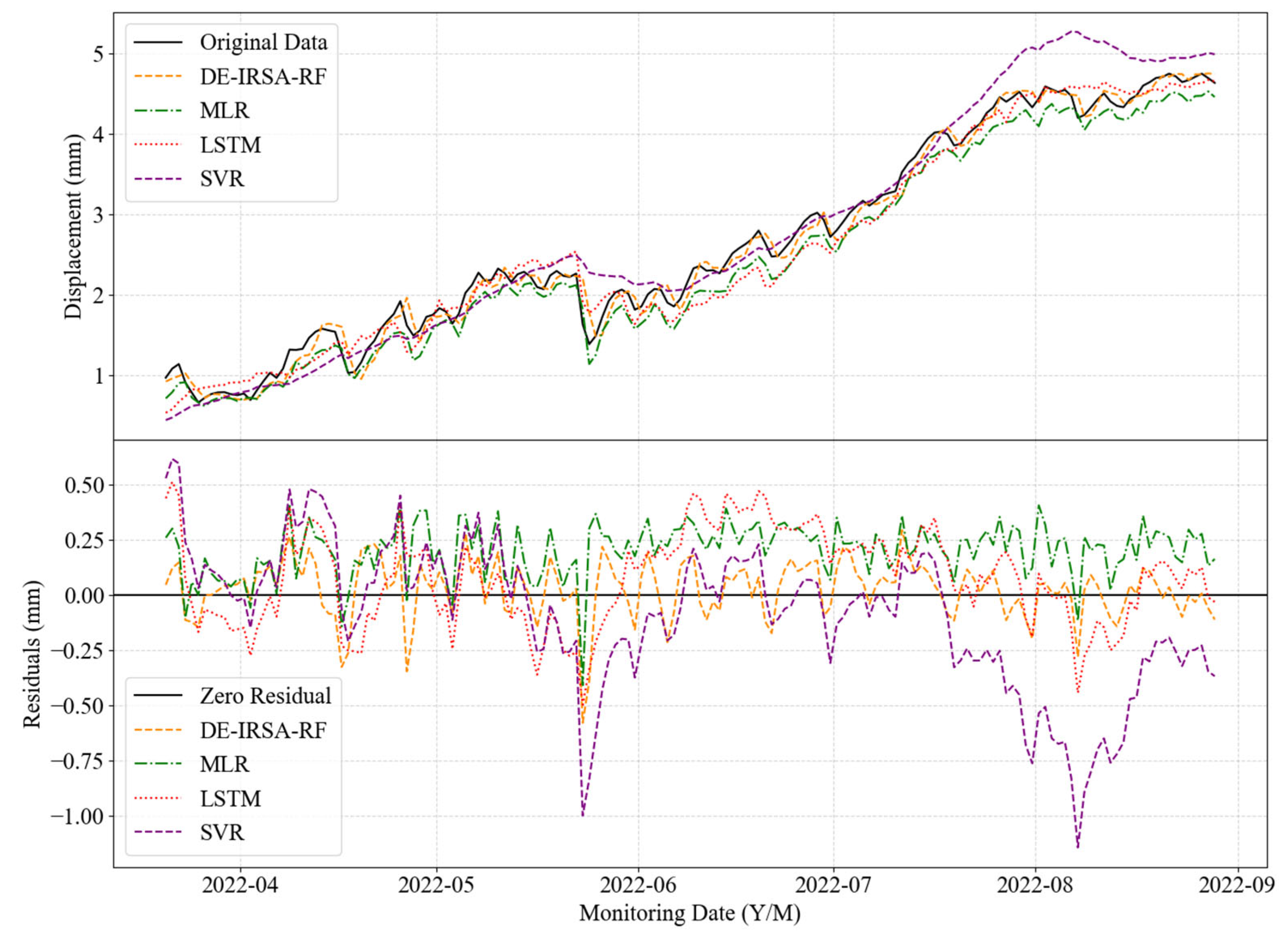- Compared to classical models such as MLR, SVR, and LSTM, the DE-IRSA-RF framework exhibits superior performance in displacement prediction tasks across different monitoring points. Its strong generalization ability and high prediction accuracy highlight its potential as a reliable tool for early risk warning and decision-making in dam safety monitoring.