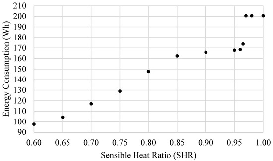 Indoor humidity varied by adjusting the sensible heat ratio (SHR) of the load. For a fixed total load, reducing SHR reallocates a portion of sensible load into latent load, representing indoor conditions with greater moisture generation. Because manufacturer data show that total capacity increases with indoor wet-bulb temperature more rapidly than power input, higher indoor humidity leads to reduced runtime for the same cooling load. The resulting decrease in runtime outweighs the increase in instantaneous power, producing a net reduction in total energy use, as shown in Figure 2. This behavior explains the counterintuitive result that systems operating under slightly more humid indoor conditions may consume less total cooling energy.