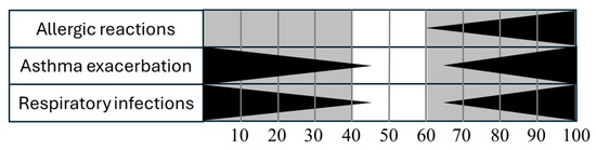 Figure 5 summarizes the potential effects of relative humidity on human health. The figure is adapted from the schematic representations in Arundel et al. [10] and Guarnieri et al. [11], combining historical and contemporary evidence on humidity-related health outcomes. The blank region between 40% and 60% RH represents the recommended safe range in which adverse effects are minimized, while the black triangles illustrate the increasing magnitude of potential health impacts, their widening base denoting greater effect severity, as humidity deviates from this optimal interval.