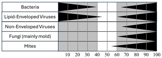 Figure 6 illustrates the relative influence of humidity on different biological agents, based on the data synthesized from Arundel et al. [10] and Guarnieri et al. [11]. This figure uses the same graphical convention introduced in Figure 5, where the central blank region represents the recommended 40–60% RH where microbial and pest activity is minimized. The black triangles indicate increasing biological activity as humidity moves away from this range.
