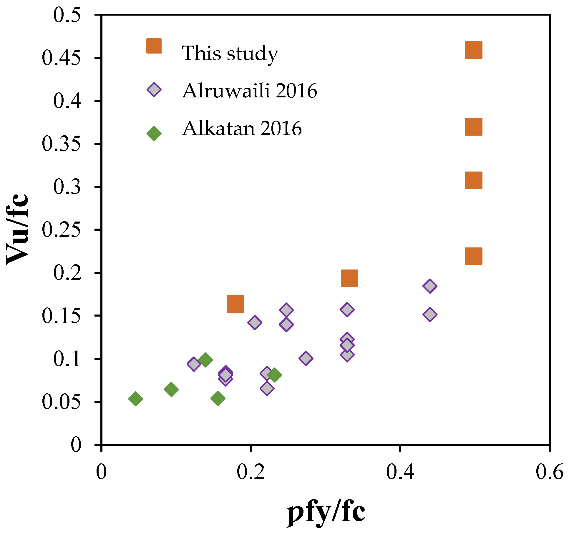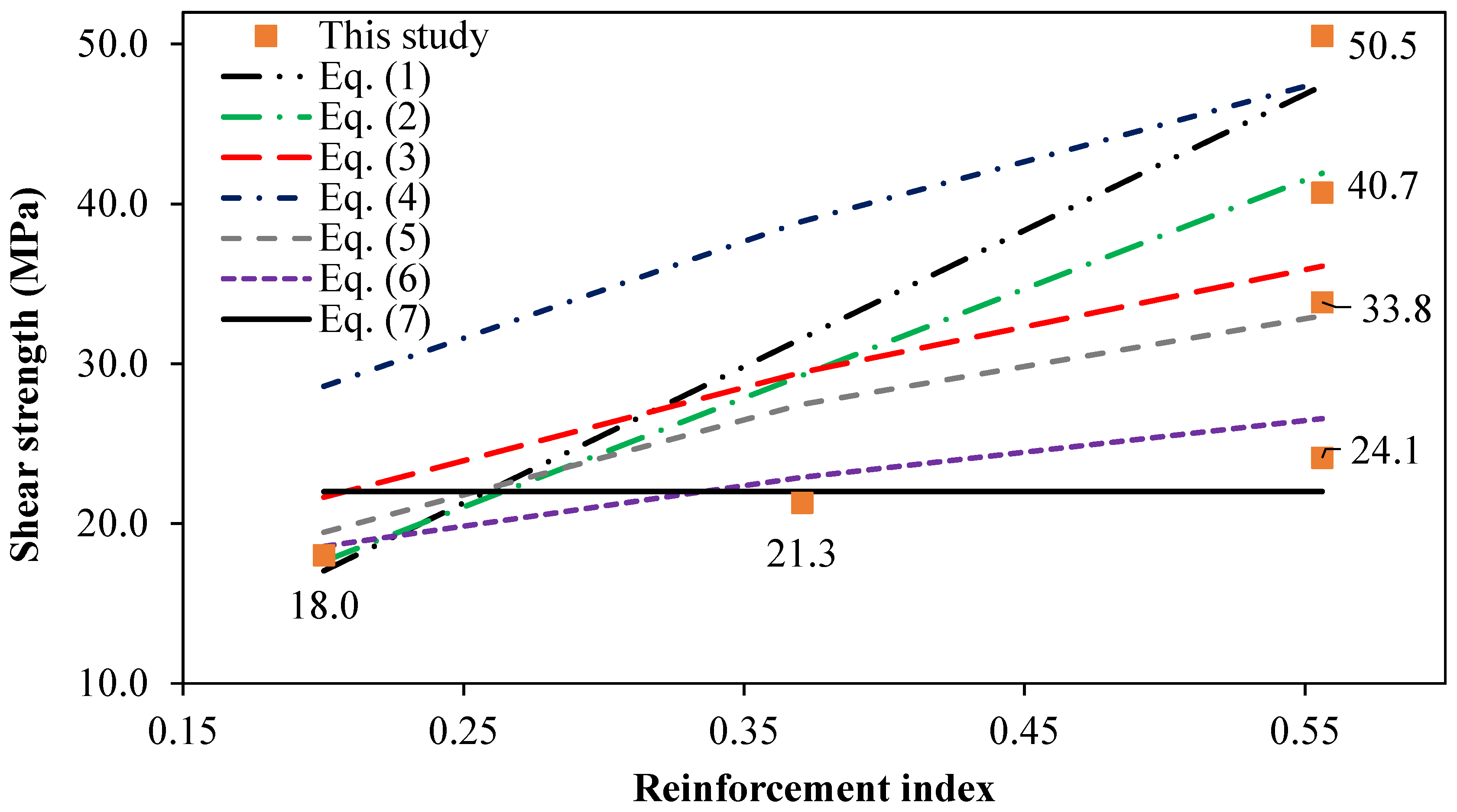 - None of the above-outlined equations, e.g., Equations (1)–(7), have provided a close prediction of the shear strength with GFRP rebars, especially for the angled shear plane. Most of them have over-predicted the ultimate shear strength.