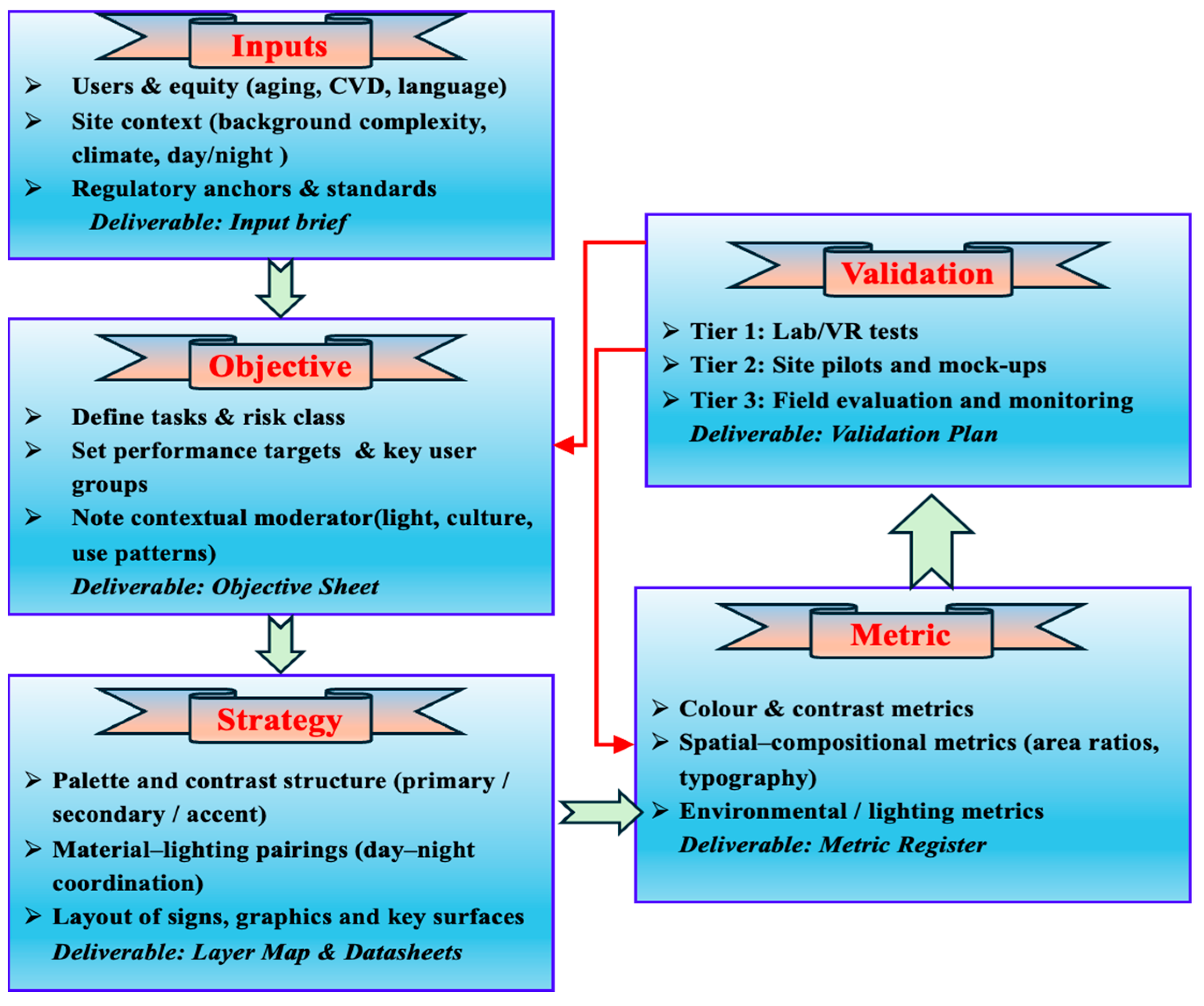 Figure 1. In this framework, Objectives specify the task class and user groups (e.g., wayfinding and egress, placemaking, daytime thermal comfort, night-time visibility), together with deployment context, hypothesized moderators and equity requirements for users with CVD or low vision. Strategies assign roles and constraints to color and light within that context, such as the structure of primary, secondary and accent palettes or rules that prioritize conspicuity over harmony. Metrics translate these strategies into instrumentable variables and conservative bands, including color-difference and luminance-contrast measures, typography geometry, surface reflectance and key night-time lighting indicators. Verification then escalates evidence from controlled laboratory or VR screening, through site pilots with luminance/illuminance and accessibility audits, to quasi-experimental field evaluations linked to explicit decision rules, inspection intervals and maintenance triggers. Inputs in the form of evidence, context and risk flow from left to right towards outputs such as specification sheets, metric registers and validation plans, closing the loop through life-cycle monitoring.