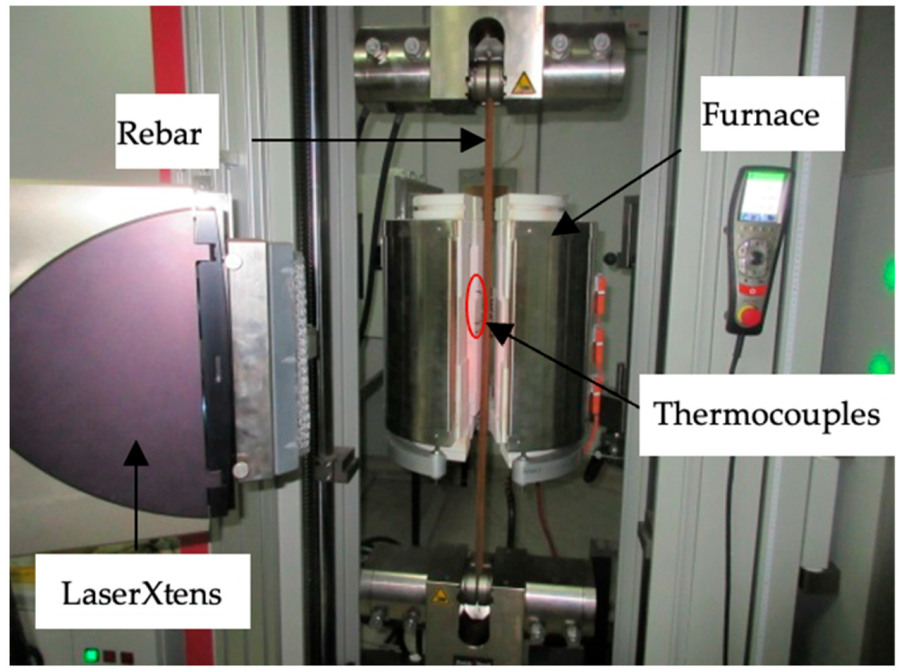 The high-temperature tensile tests on the steel reinforcement were conducted using a Zwick Z100TEW universal testing machine (Ulm, Germany), with a maximum load capacity of 250 kN. The high-temperature furnace used has a temperature range of 200–1100 °C, with a temperature fluctuation of ±2 °C during the testing process. Displacement was measured using a fully automatic, high-precision laser extensometer (laserXtens, Ulm, Germany). The extensometer has a gauge length of 64 mm and a resolution of 0.15 μm. The setup for the high-temperature tensile testing equipment is shown on