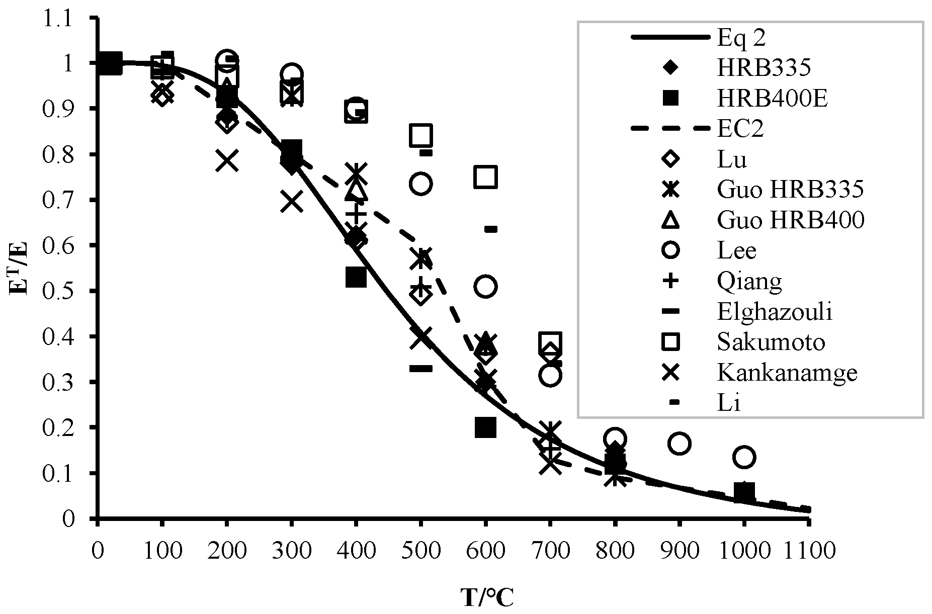 Figure 5 presents the measured modulus of elasticity of steel bar at different temperatures. As can be seen from the figure, the measured results from various researchers [
