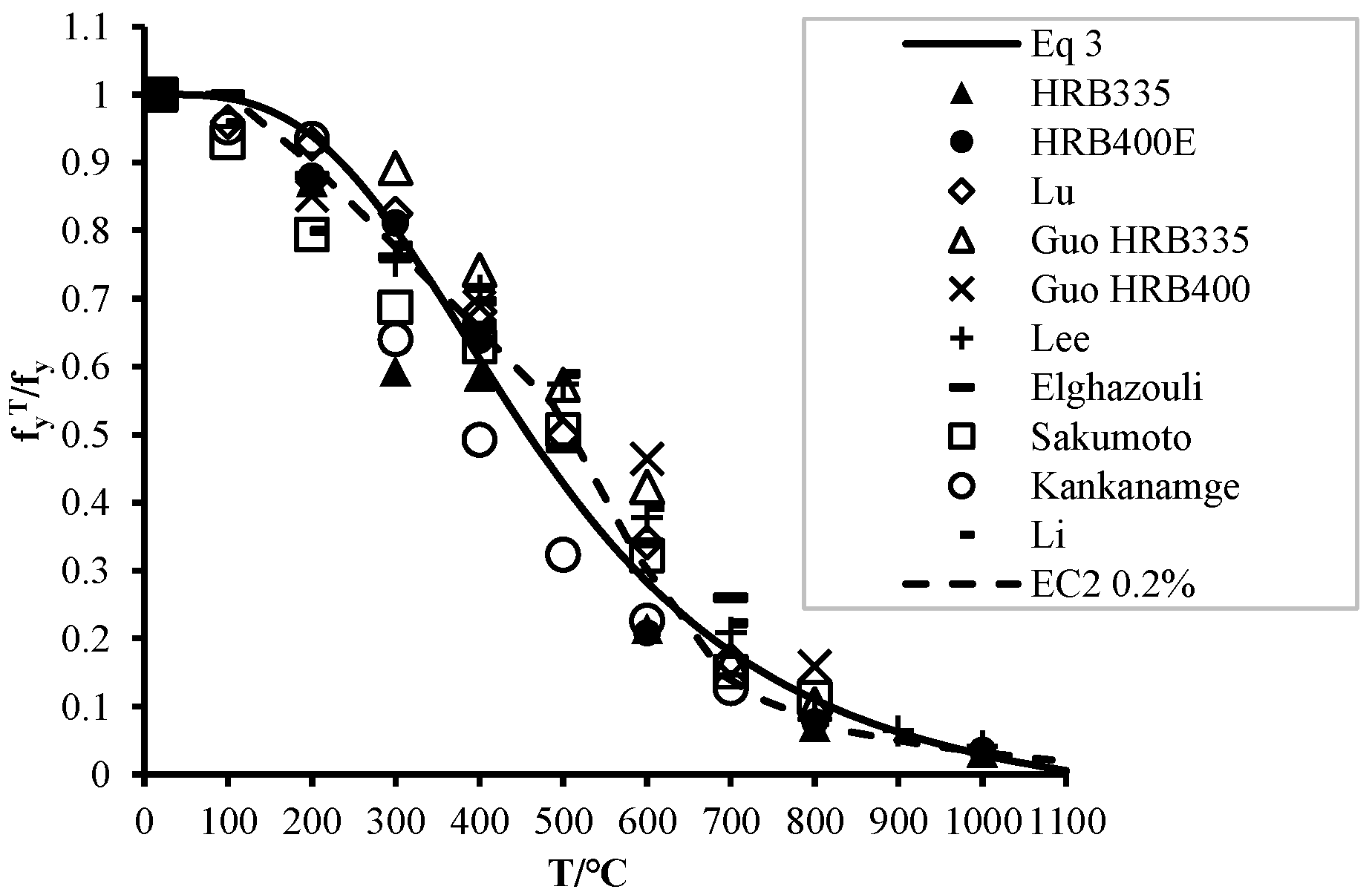 Figure 6 presents the experimental results for the yield strength of steel bar at elevated temperatures. Similarly to the modulus of elasticity at high temperatures, the test results from different researchers [