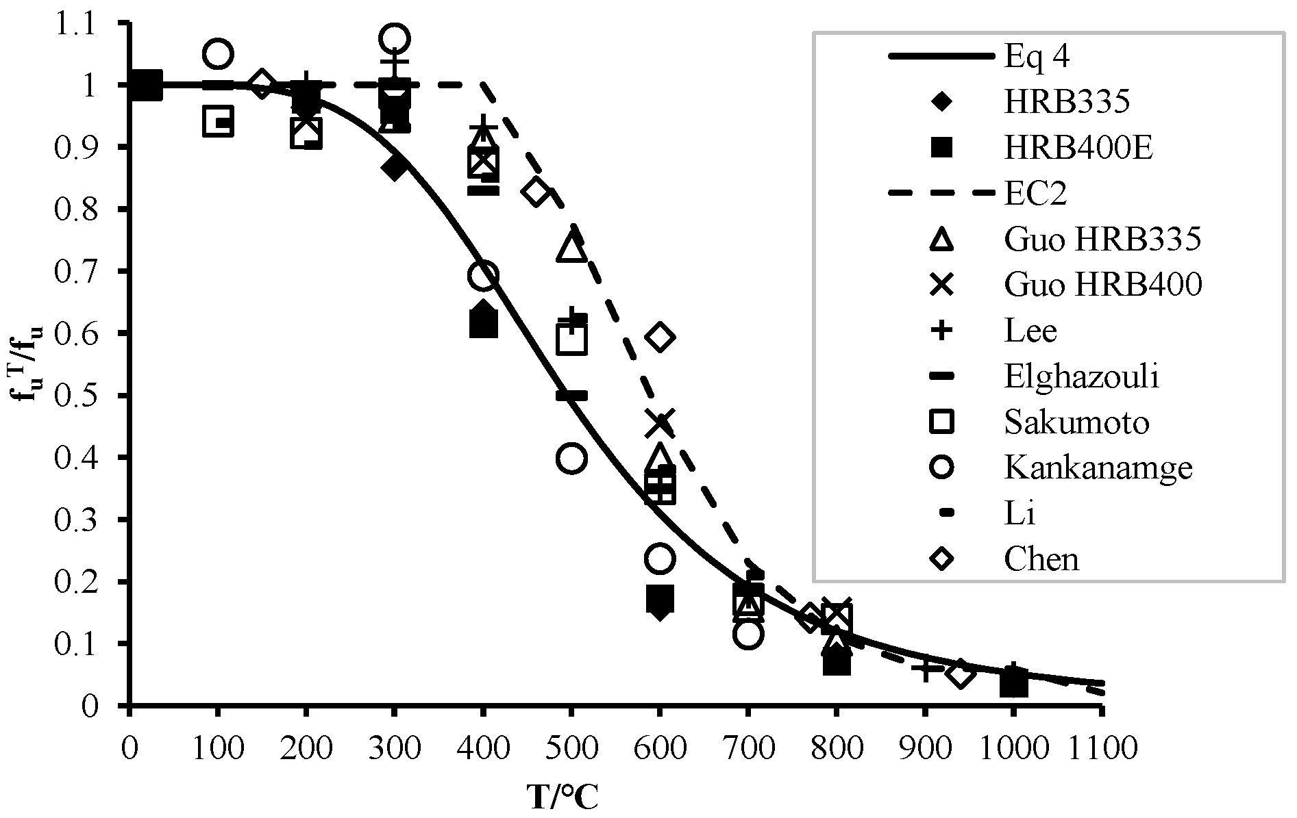 Figure 7 presents the experimental results for the ultimate strength of steel bar at elevated temperatures [