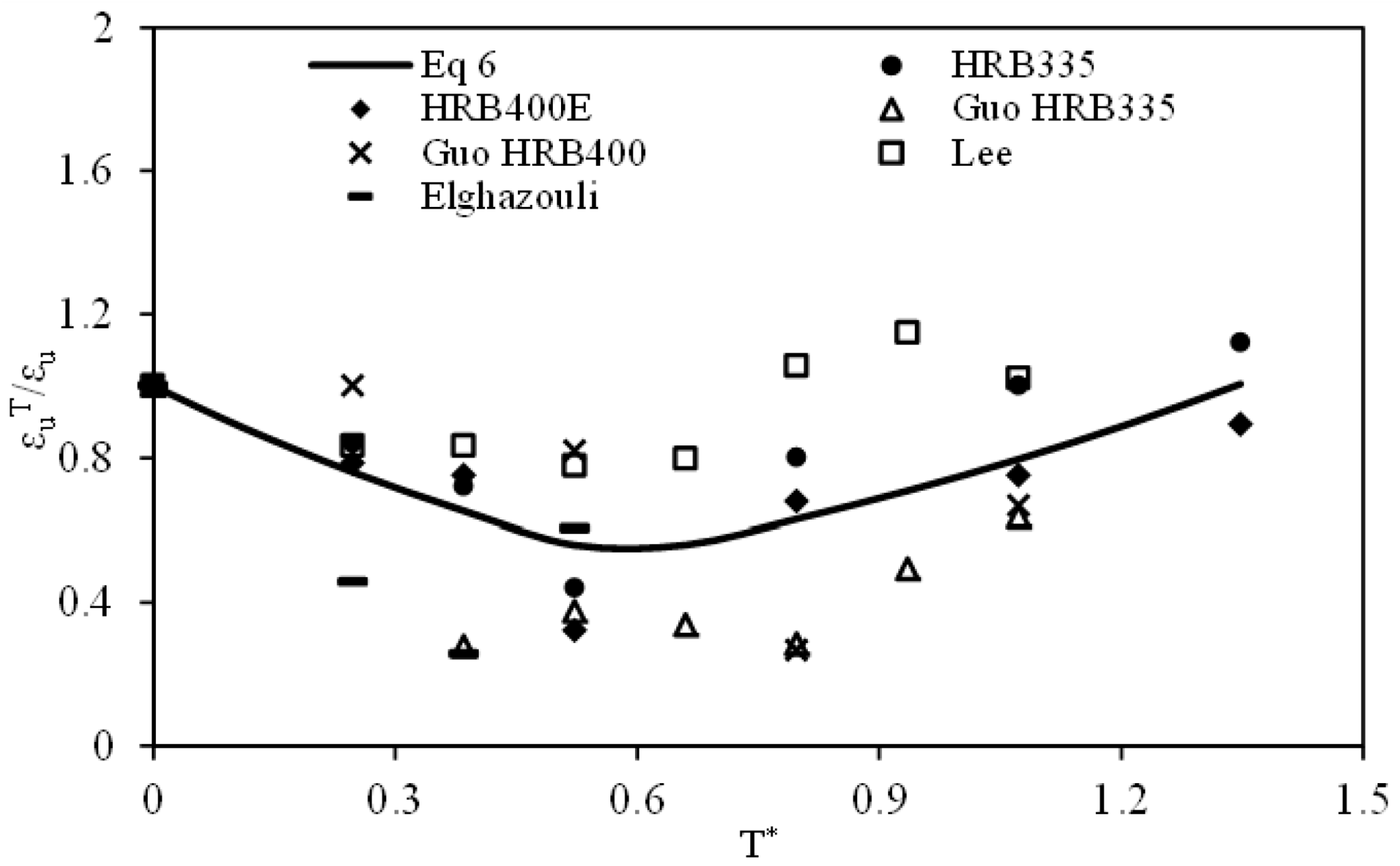 and the normalized temperature can be approximately described by an exponential function. Equation (6) gives this relationship for the ultimate strain of steel bar at elevated temperatures.