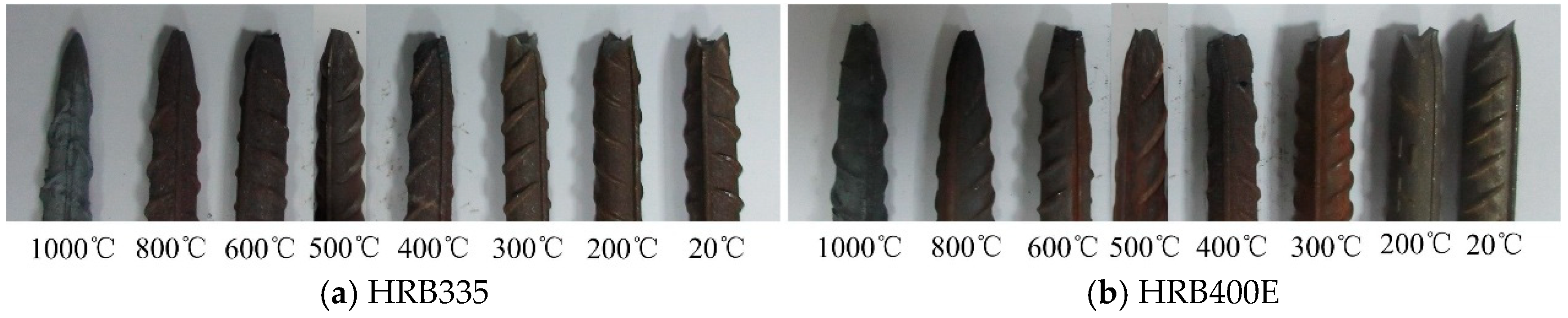 10] does include a detailed constitutive model, describing the evolution of ultimate strength and ultimate strain with temperature, but its practical application is hindered by a large number of required parameters. To address these limitations, this study conducted static tensile tests on hot-rolled ribbed bars (HRB335 and HRB400E) at various temperatures. Based on the observed characteristics of the measured stress–strain curves, a new constitutive model for steel reinforcement at elevated temperatures is proposed. Furthermore, by integrating experimental data with existing domestic and international research, the temperature-dependent variations in key mechanical properties, including the modulus of elasticity, yield strength, ultimate strength, strain at the onset of strain hardening, ultimate strain, and the characteristics of the yield plateau, were systematically analyzed. Finally, a fracture analysis of the tensile specimens is performed to elucidate the underlying failure mechanisms of steel reinforcement under high-temperature conditions.