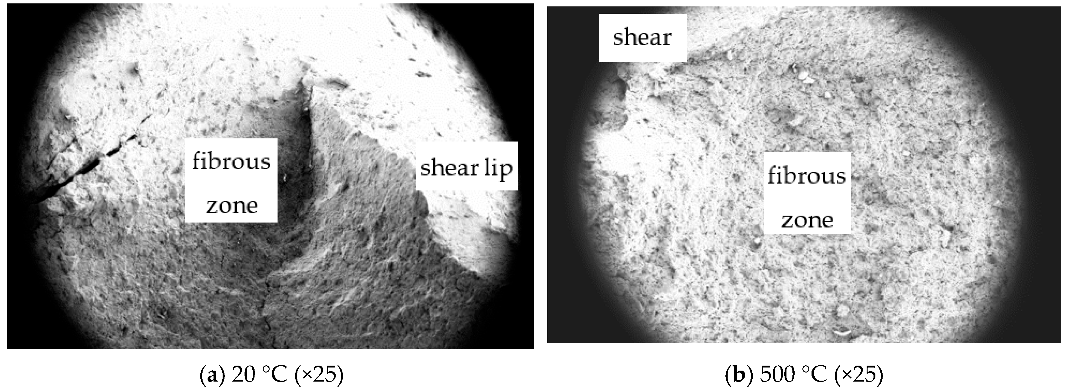 Figure 10 shows the macroscopic morphologies of the fracture surfaces for HRB400E steel bars tested at ambient temperature and 500 °C.