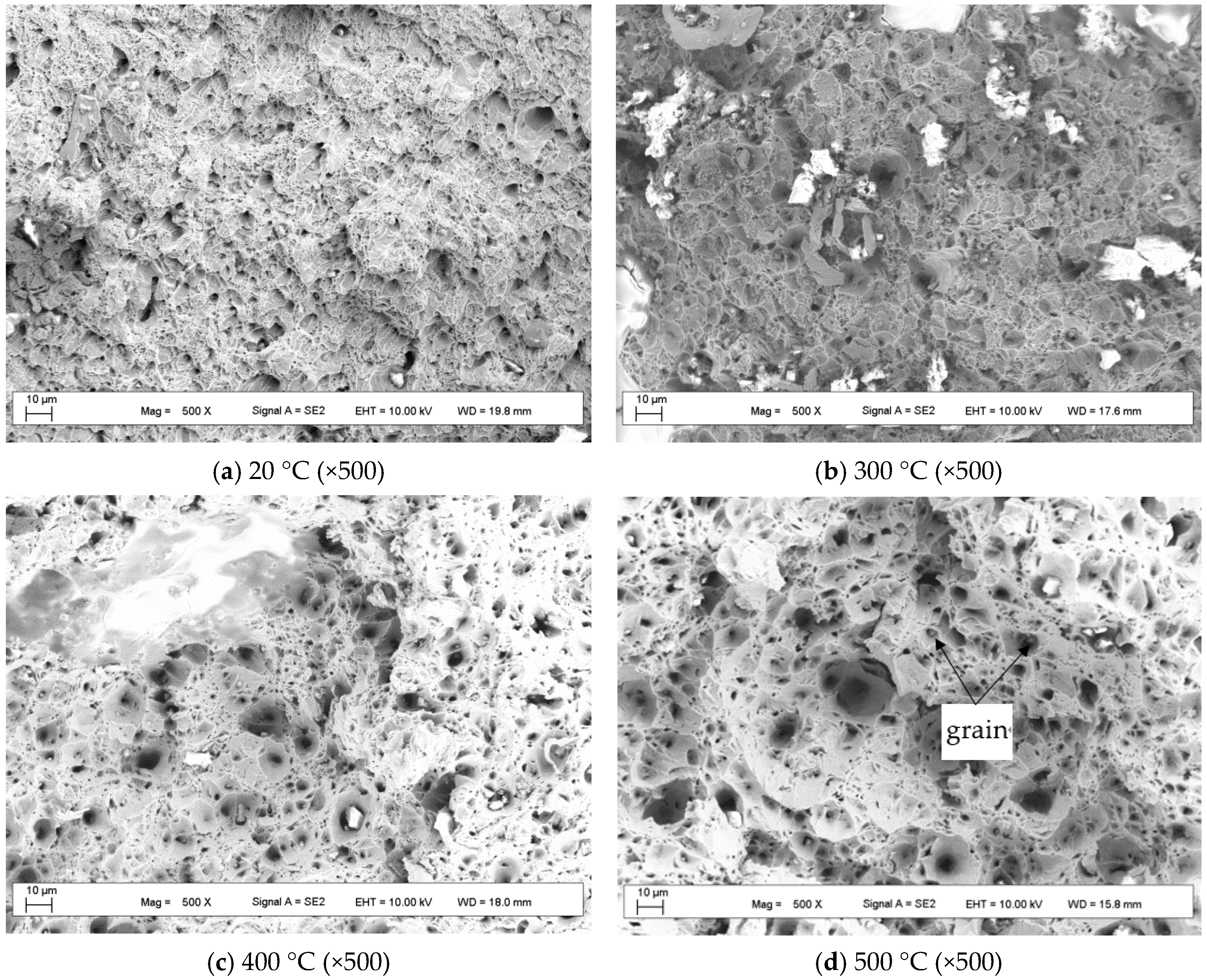 However, when the temperature rises to 500 °C, the number of dimples on the fracture surface significantly increases, reflecting enhanced plasticity. Concurrently, it can be observed that as the temperature increases, both the diameter and depth of the dimples gradually enlarge. This is attributed to the increased cohesiveness between particles at higher temperatures, requiring microvoids to coalesce and grow to a larger size before fracture occurs, consequently leading to the increase in dimple size and depth. The presence of fine grains observed in