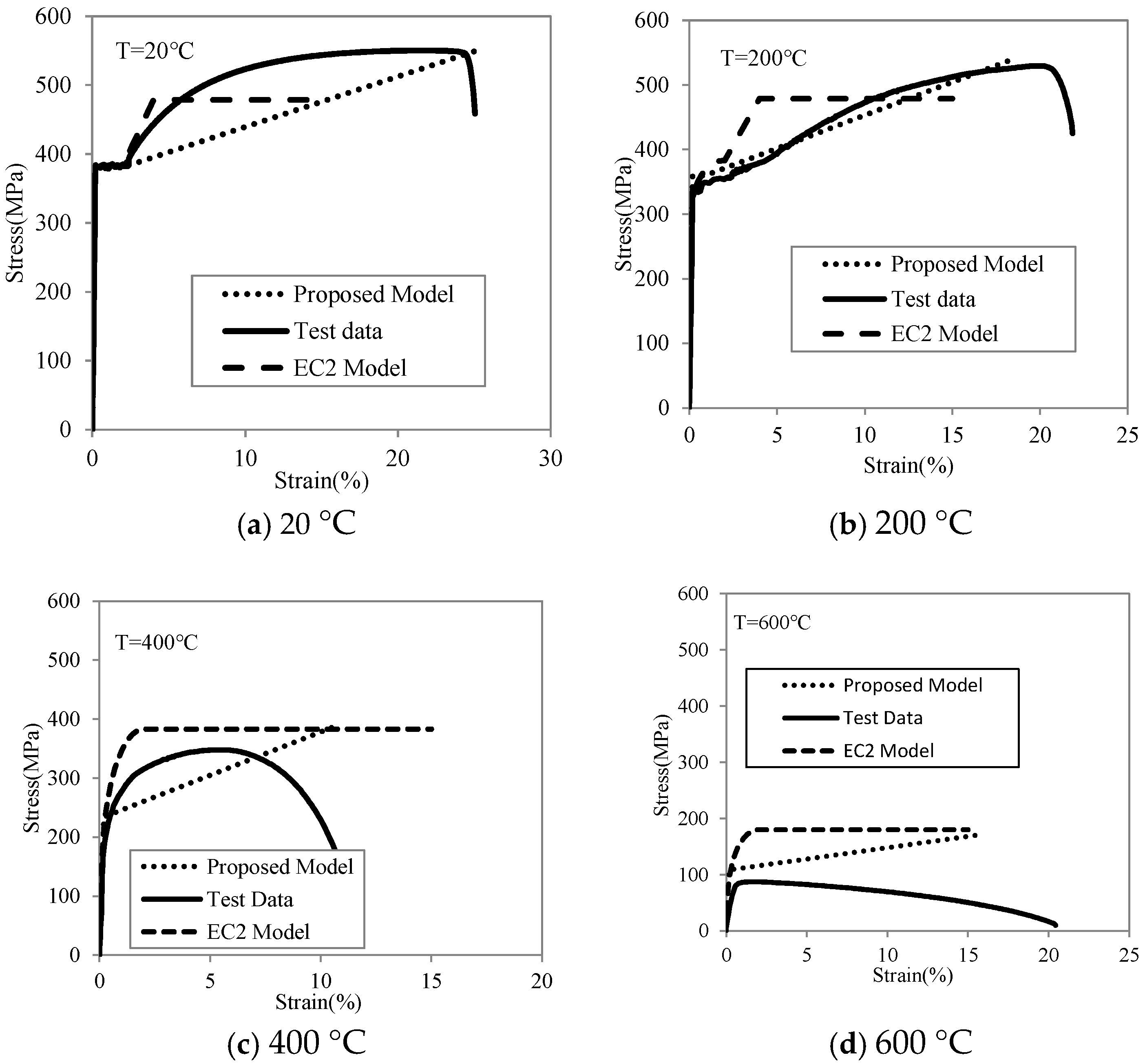Figure 1). This sophisticated framework employs a unified continuous function coupled with temperature-dependent parameters to establish a comprehensive stress–strain—temperature relationship, demonstrating advantages in numerical simulation applications. However, the model neglects temperature-induced evolution of ultimate strain. In a modified approach, Quiel [