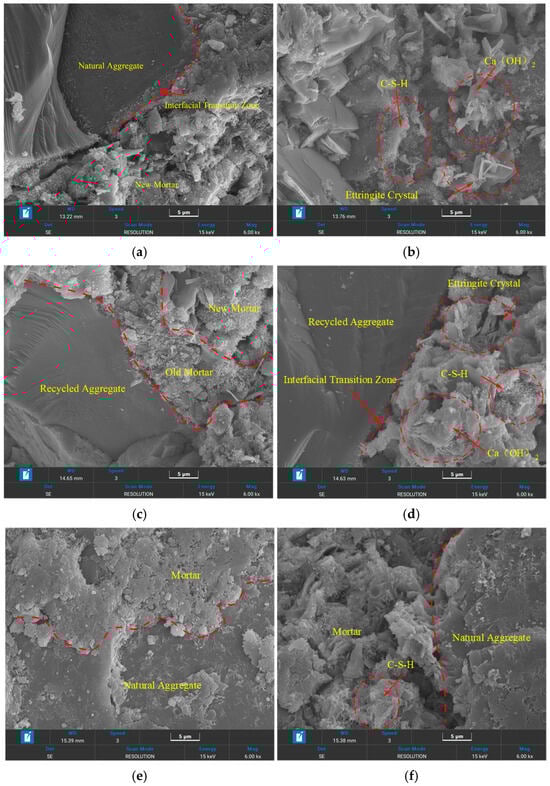 Scanning electron microscopy (SEM) was employed to observe the microstructure of the aggregate–mortar interfacial transition zone (ITZ) in both NAC and RAC at early and later stages (as shown in Figure 5). SEM images were captured at 6000× magnification.