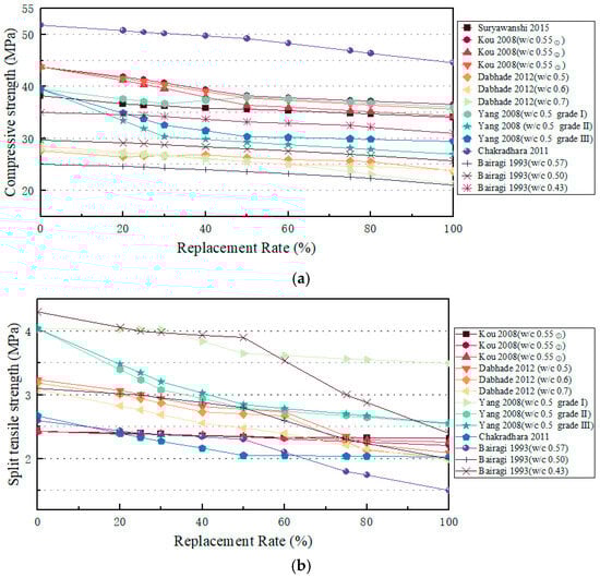 Behavior of RAC from prior studies [8,13,14,17,18,38]: (a) compressive strength, (b) split tensile strength, and (c) elastic modulus. Note: ① Recycled aggregates are sourced from Tseung Kwan O, Hong Kong. ② Recycled aggregates are sourced from Tseung Kwan O and further crushed using hammers and hammer crushers. ③ Recycled aggregates are sourced from the old Kai Tak Airport in Hong Kong.