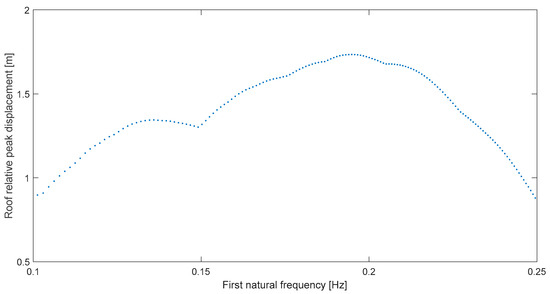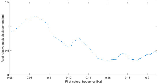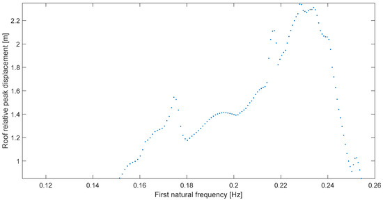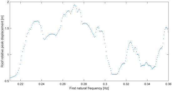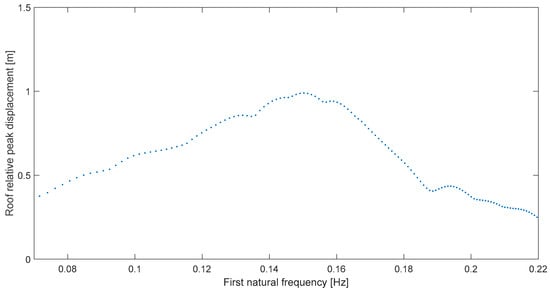 First, the example structure is defined; it is a five-story (N = 5) building with parameters mi = 6 × 105 kg and ci = 3 × 104 Ns/m, while ki = k is the chosen parameter allowed to vary to search for or attain resonance. That story damping coefficient implies a lightly damped system as discussed in Section 2; to be more precise, the damping factor ζ = 2% (ci/2miωn) if resonance is imposed (or if the story natural frequency is equal to 0.18 Hz which is a mean predominant frequency [15]). The real near-field strong motions were defined also in Section 2, and these are the inputs here to the structural system, to obtain the resonance graphs as Figure 2. Again, these plots show the peaks of the displacement time history of the 5th floor or roof as a function of the main natural frequency of the building. The peak of this plot, in turn, is located and it defines the resonant frequency ωr, as in the illustrative plot (Figure 2). It can be said, then, that the resonance presented is the “peak of peaks”, being the plural for the time domain and the singular for the frequency domain.