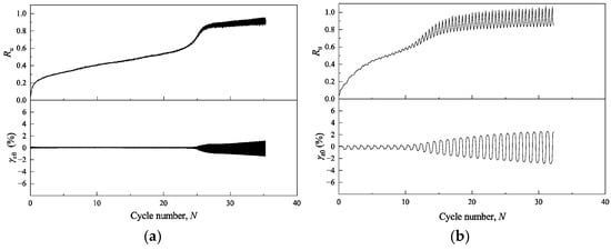 However, the high elastic property of granulated rubber also causes the deformation of the specimen to increase, which can also be seen from the phenomenon that the shear strain of the specimen increases with the rubber content, as reflected in Figure 6. Such a response was correlated with a gradual reduction in both stiffness and strength as the rubber content increased, as shown in Figure 7, which plots the variation in the hysteretic loops of the specimens in the last few cycles. Based on Figure 7, the deformation modes of all specimens in the cyclic liquefaction test were symmetric, and the hysteresis curve of the specimen was transformed from a Z shape to an anti-S shape with the increase in the rubber content in sand, reflecting the weakening of the sliding influence and the enhancement of the energy dissipation capacity. In addition, the area of the hysteretic loop of the sand–rubber mixtures was larger than the pure sand, meaning that more energy was required to rearrange and rotate the particles of the mixture; thus, the contraction of the mixture easily occurred, resulting in a continuous increase in shear strain from the initial loading stage, which was completely different from the phenomenon that the shear strain of pure sand is almost zero before the 25th cycle.