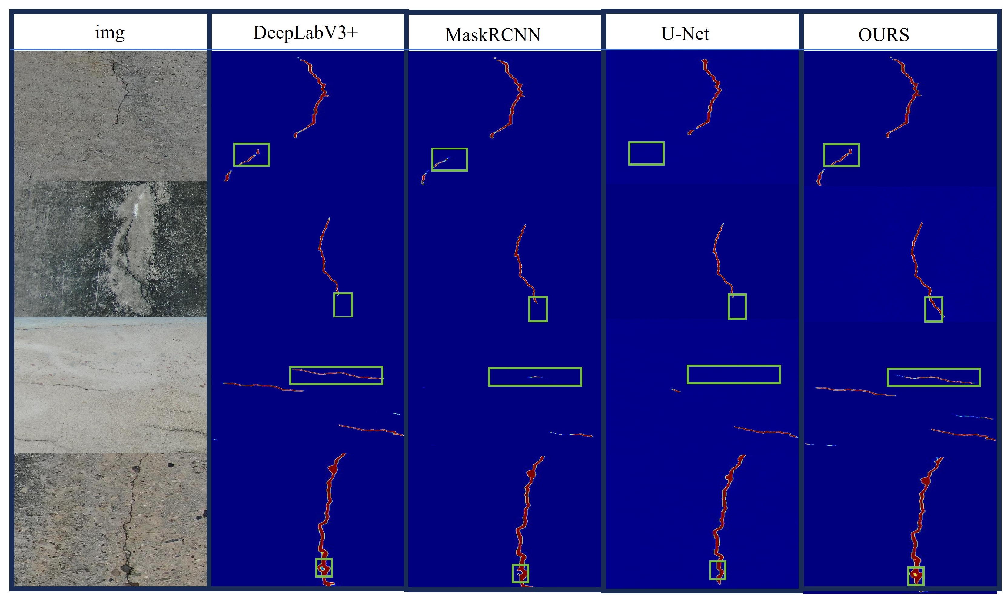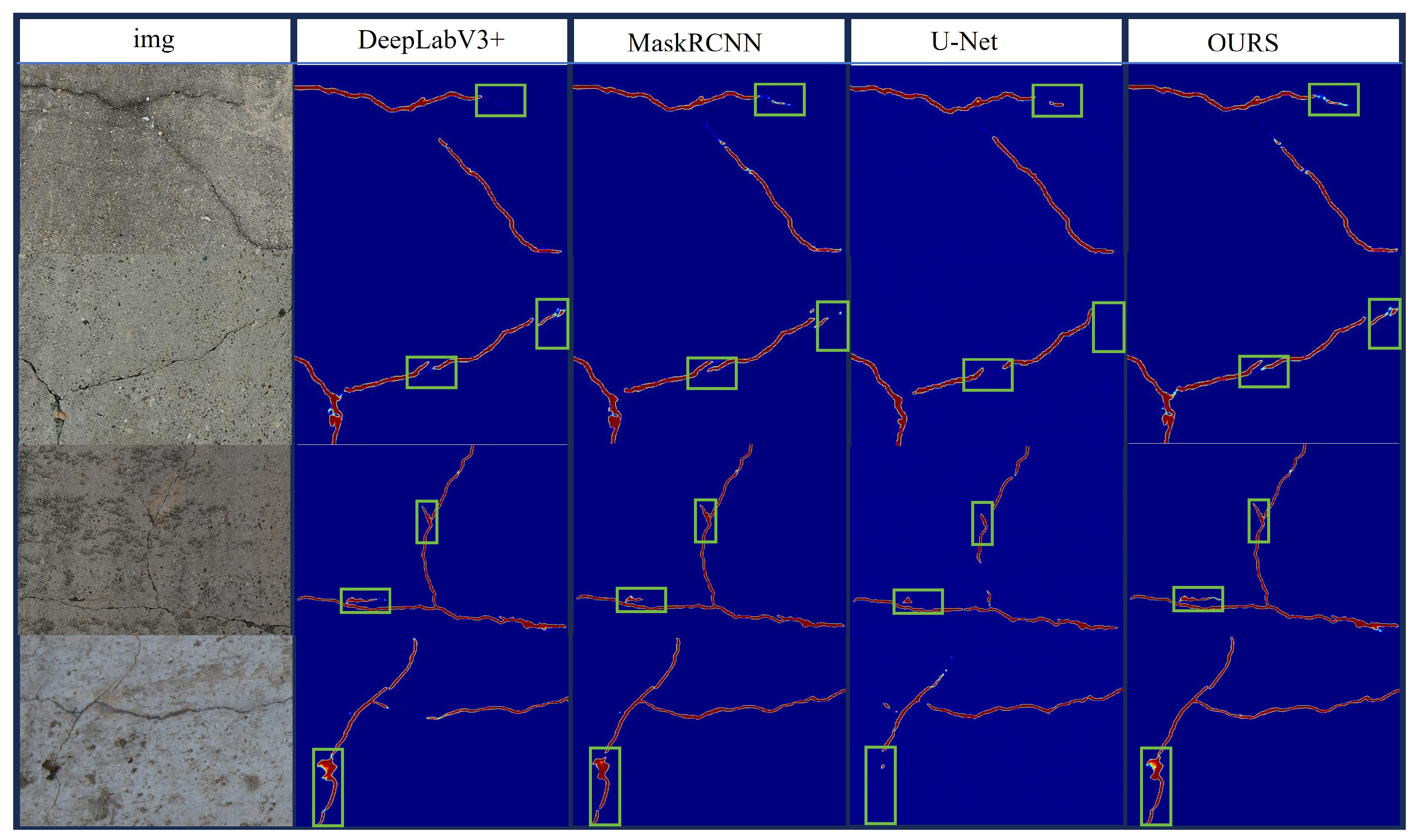 - Wu, K.; Peng, B.; Zhai, D. Boundary-Aware Axial Attention Network for High-Quality Pavement Crack Detection. IEEE Trans. Neural Netw. Learn. Syst. 2024, 36, 13555–13566. [Google Scholar] [CrossRef]