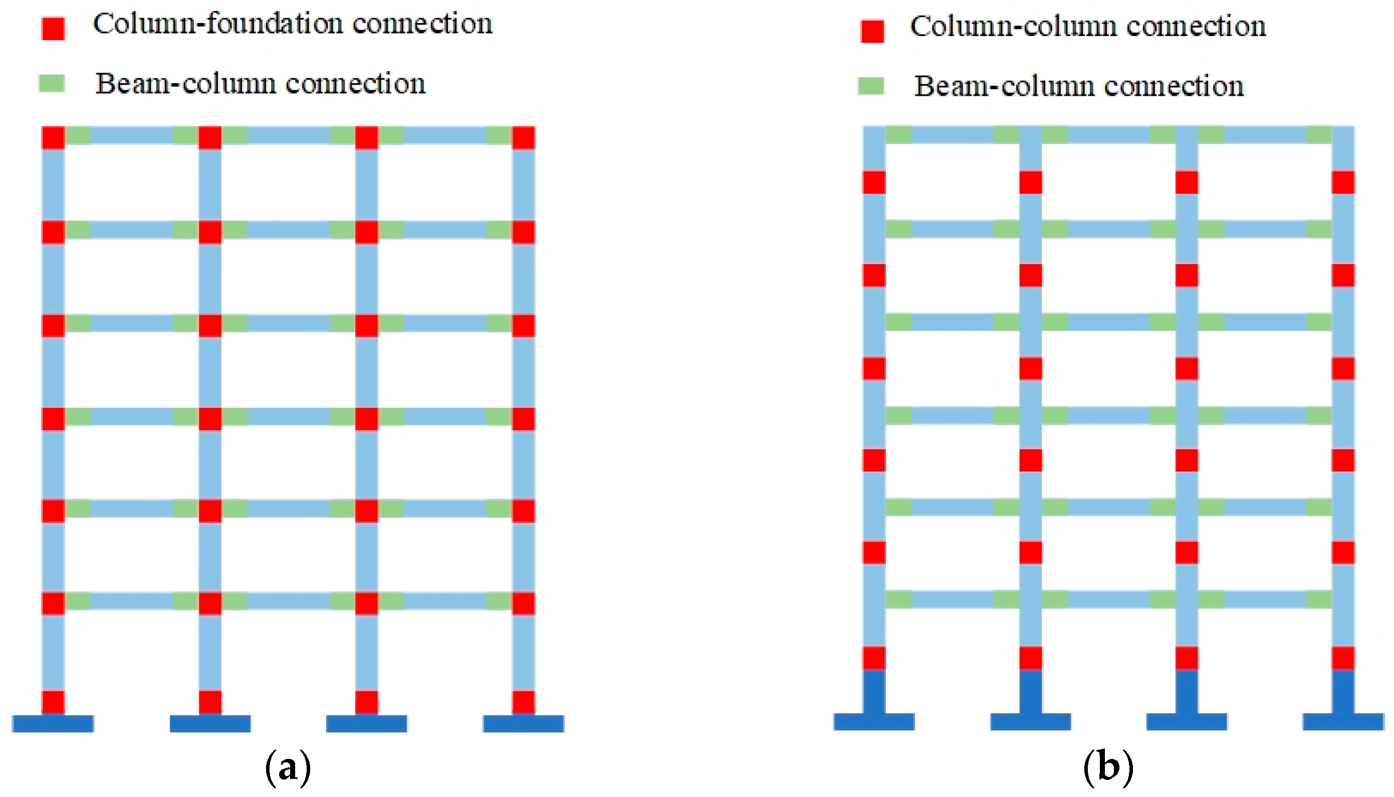 - Tullini, N.; Minghini, F. Grouted sleeve connections used in prefabricated reinforced concrete construction–experimental investigation of a column-to-column joint. Eng. Struct. 2016, 127, 784–803. [Google Scholar] [CrossRef]