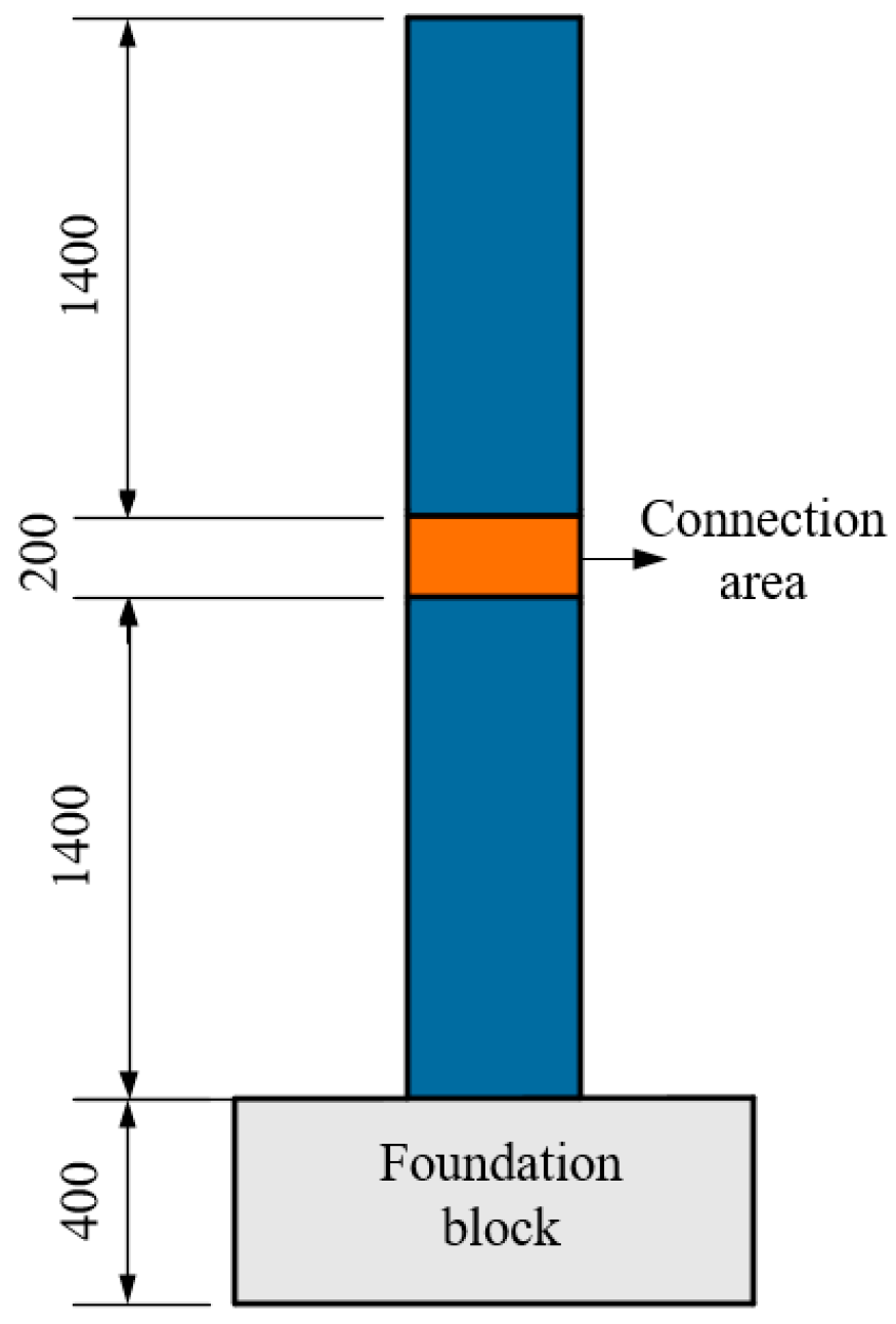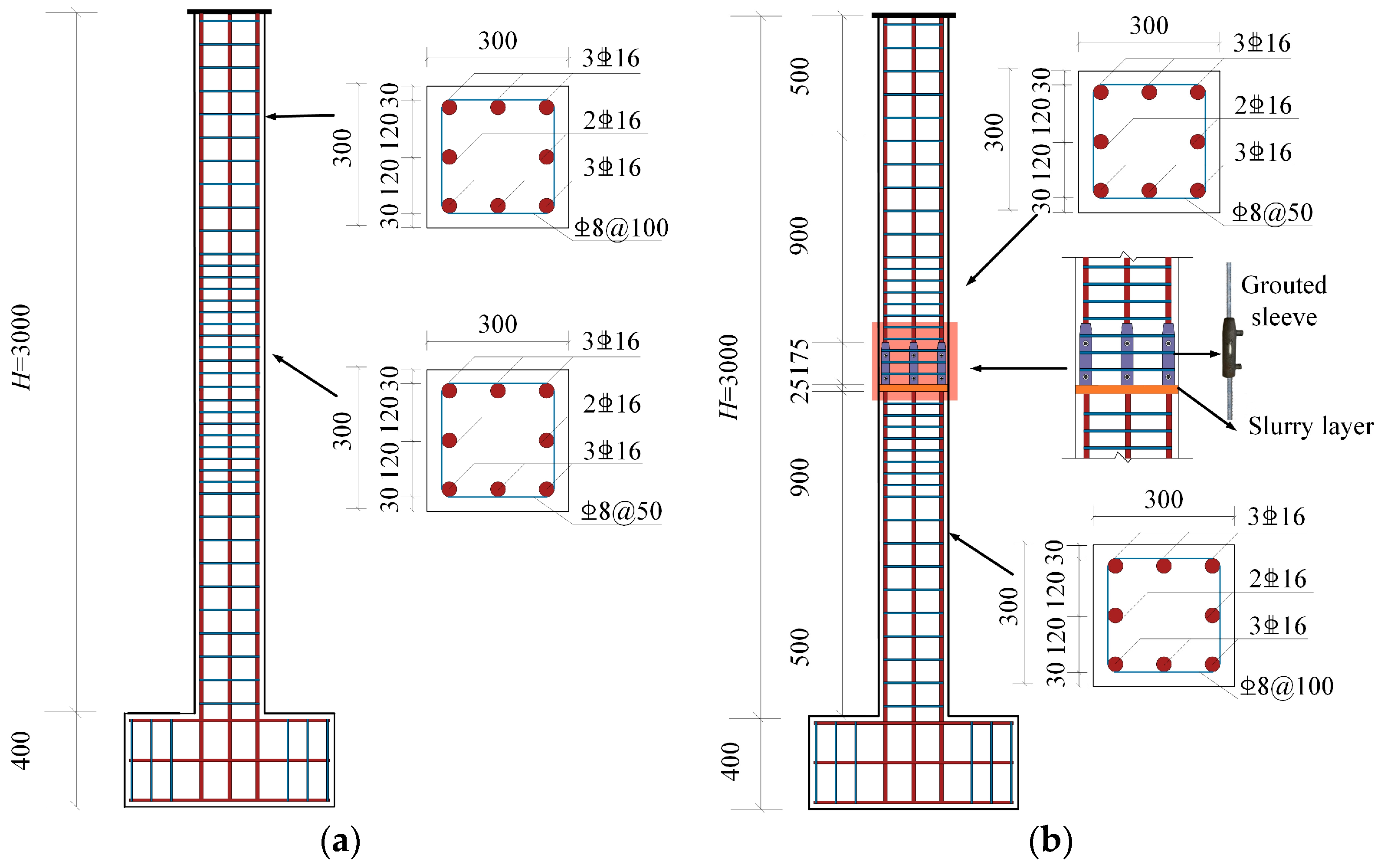 - Xu, L.; Pan, J.L.; Guo, L. Mechanical performance of prefabricated RC columns with grouted sleeve connections. Eng. Struct. 2022, 252, 113654. [Google Scholar] [CrossRef]