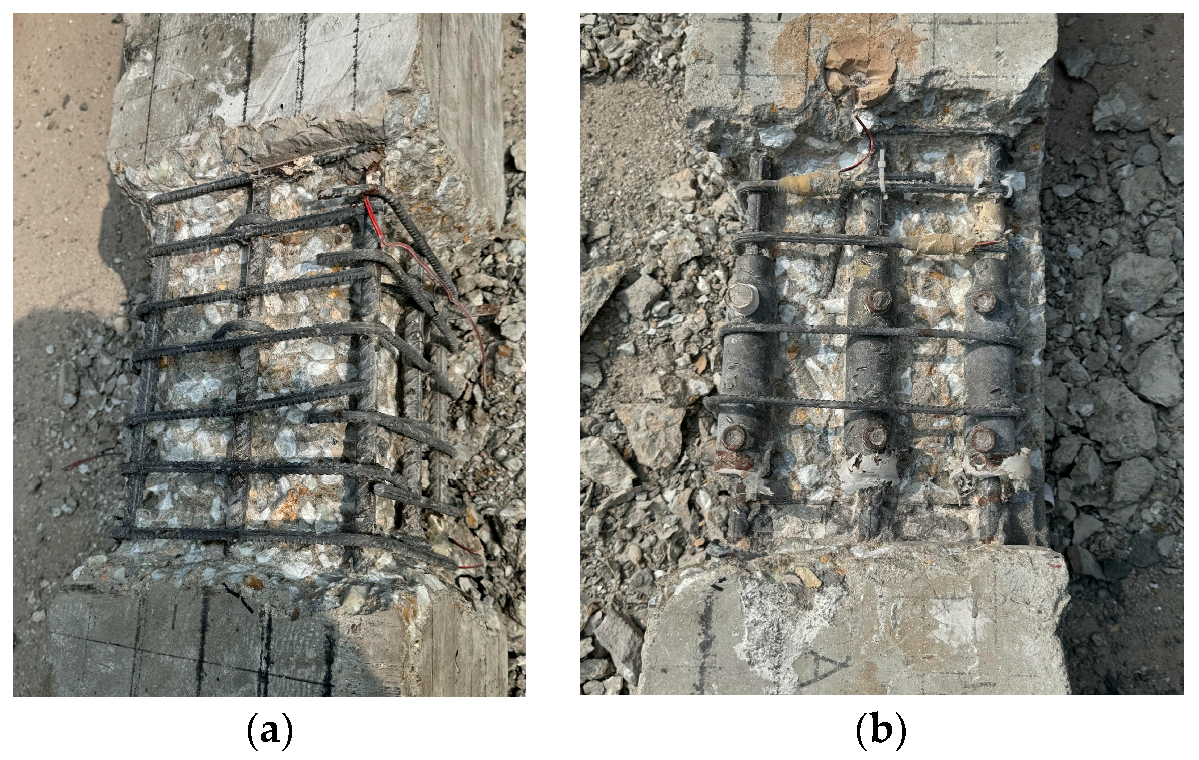 - Xia, J.; Chen, J.J.; Shan, K.; Wu, Y.F. Seismic performance of corroded prefabricated column-footing joint with grouted splice sleeve connection: Experiment and simulation. J. Build. Eng. 2023, 80, 108112. [Google Scholar] [CrossRef]