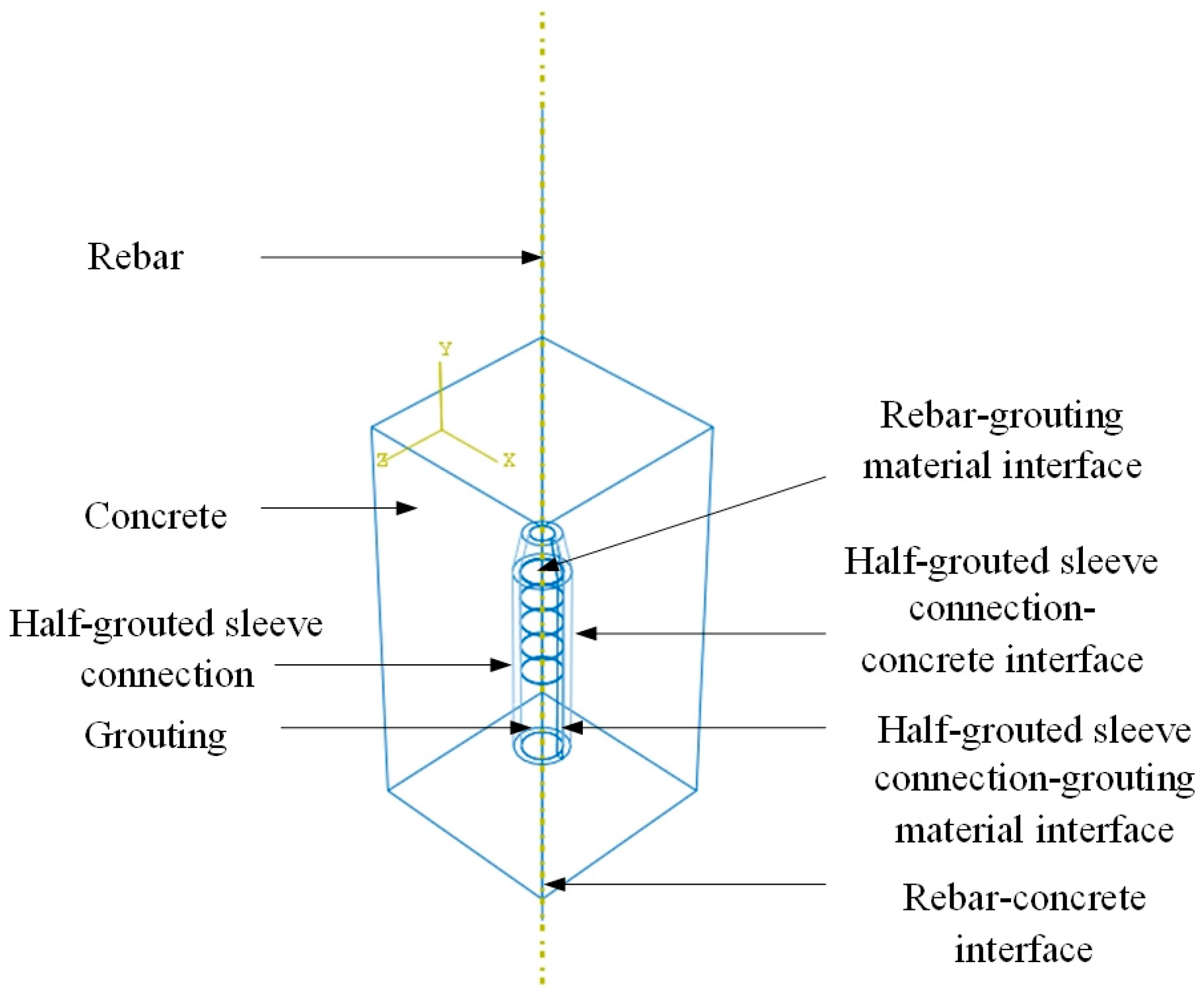 - Using the full constitutive model of the half-grouted sleeve connection with concrete cover to address convergence challenges associated with sleeve-connected columns. The numerical results generally aligned well with the experimental data and had strong predictive power for damage localization and failure mechanisms.
