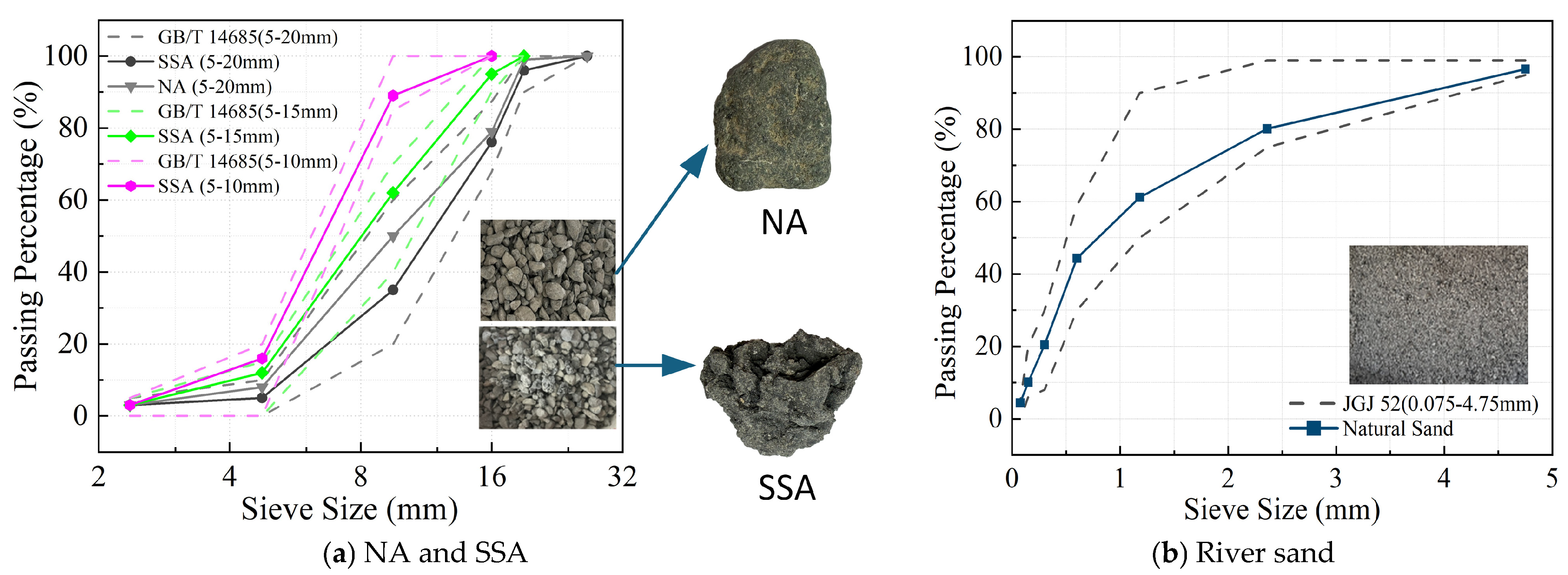 - Tian, Y.; Wang, L.; Kong, D.; Zhou, T.; Ren, C.; Yang, R.; Yuan, Q. Effect Evaluation and Mechanism Analysis of Steel Slag Fine Aggregate on the Strengths of Recycled Aggregate Concretes. Eur. J. Environ. Civ. Eng. 2025, 29, 1178–1195. [Google Scholar] [CrossRef]