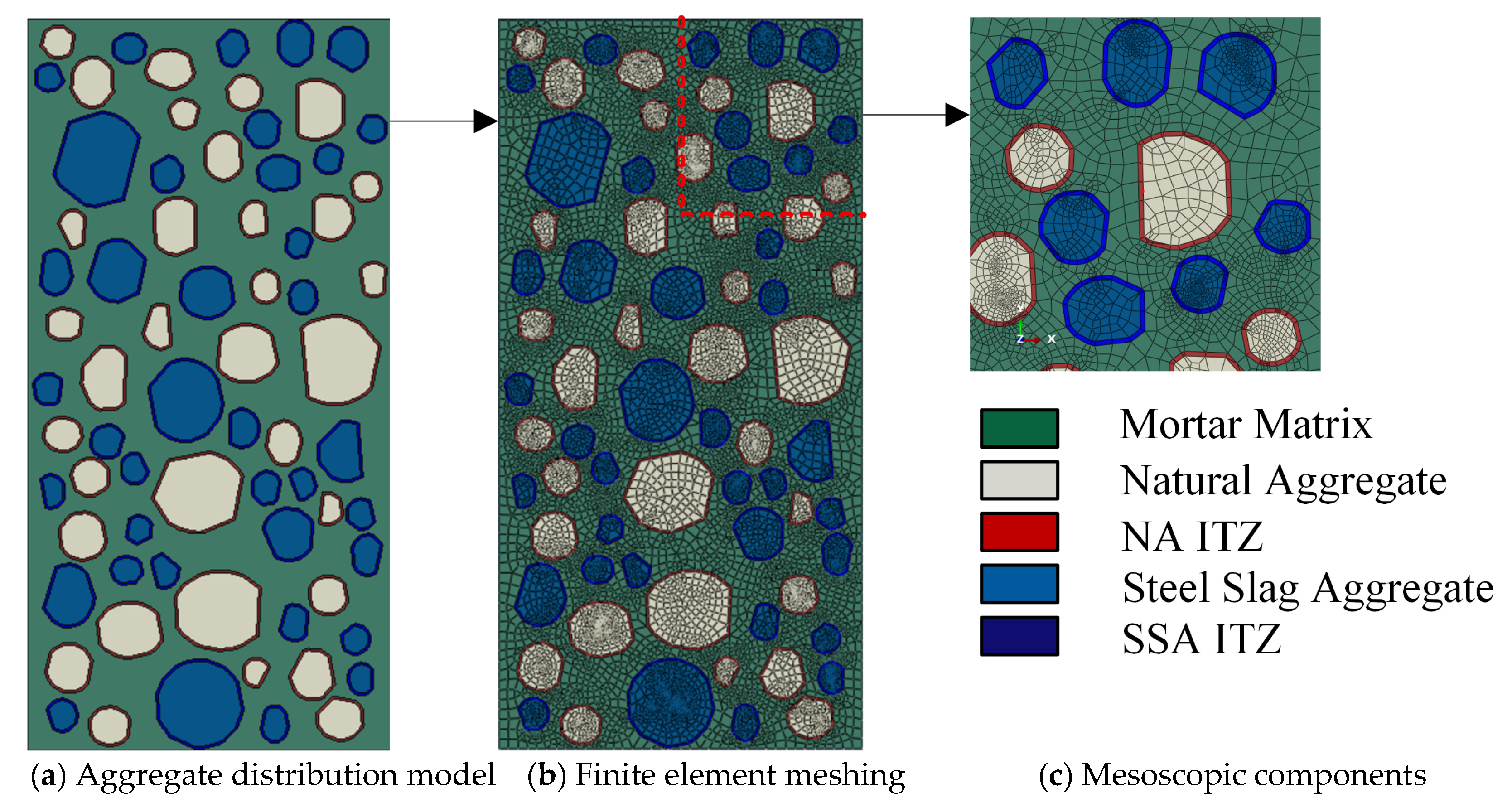 2.2. Mesoscopic Model of Steel Slag Coarse Aggregate Concrete and Its Constitutive Relationship