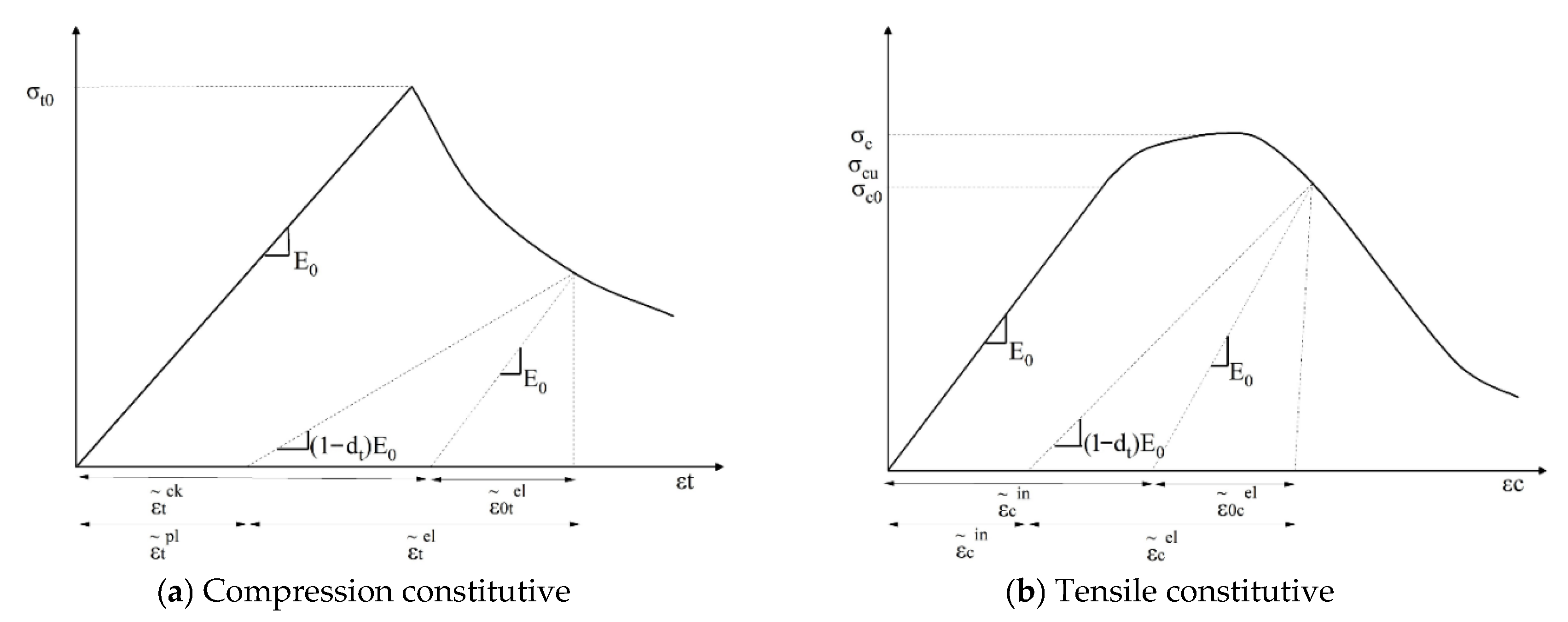 - Lubliner, J.; Oliver, J.; Oller, S. A plastic-damage model for concrete. Int. J. Solids Struct. 1989, 25, 299–326. [Google Scholar] [CrossRef]