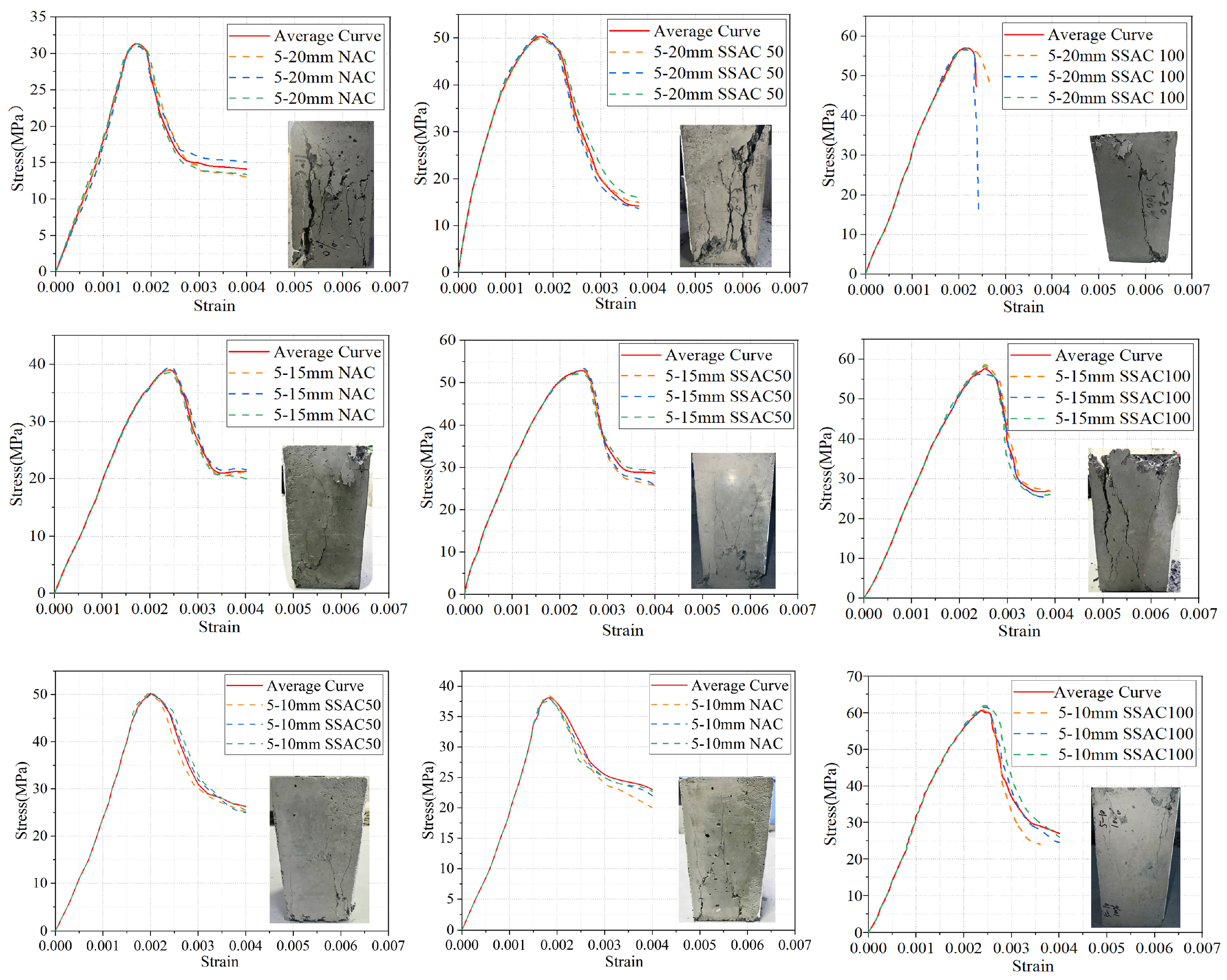 - The failure modes of SSAC and NAC are fundamentally similar, with both evolving from the propagation of internal microcracks to the formation of macroscopic diagonal cracks. However, compared with NAC, SSAC with a 5–20 mm aggregate size exhibits faster macroscopic crack development and more pronounced acoustic effects during failure. In terms of mechanical response, the stress–strain curve of SSAC is steeper with a more abrupt descending branch; as the aggregate size range decreases, the descending branch becomes gentler, whereas a rise in the SSA replacement ratio results in a steeper descending branch.