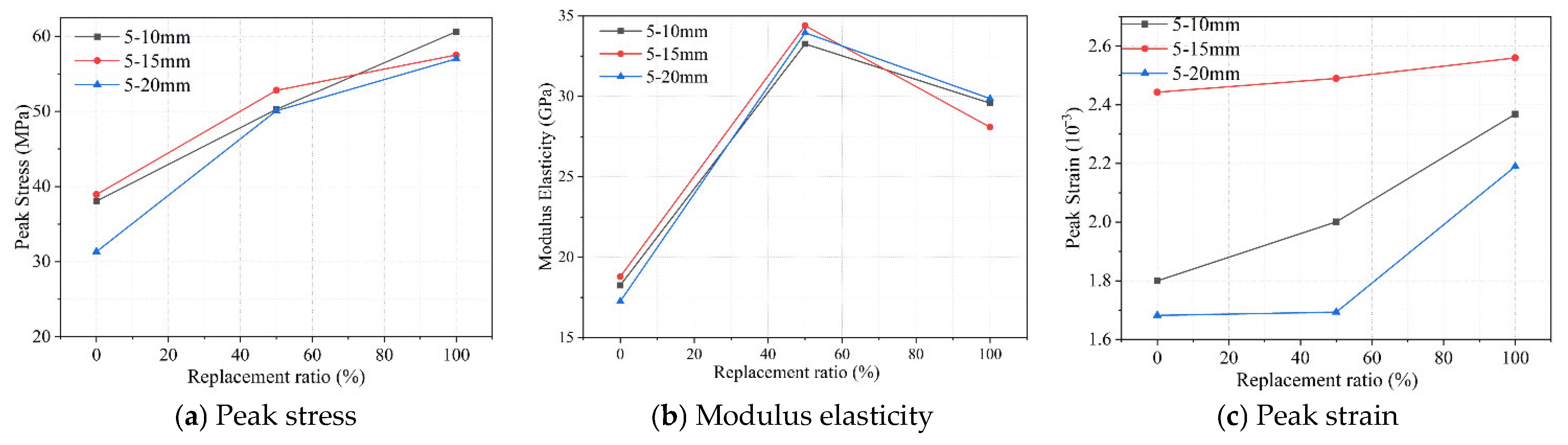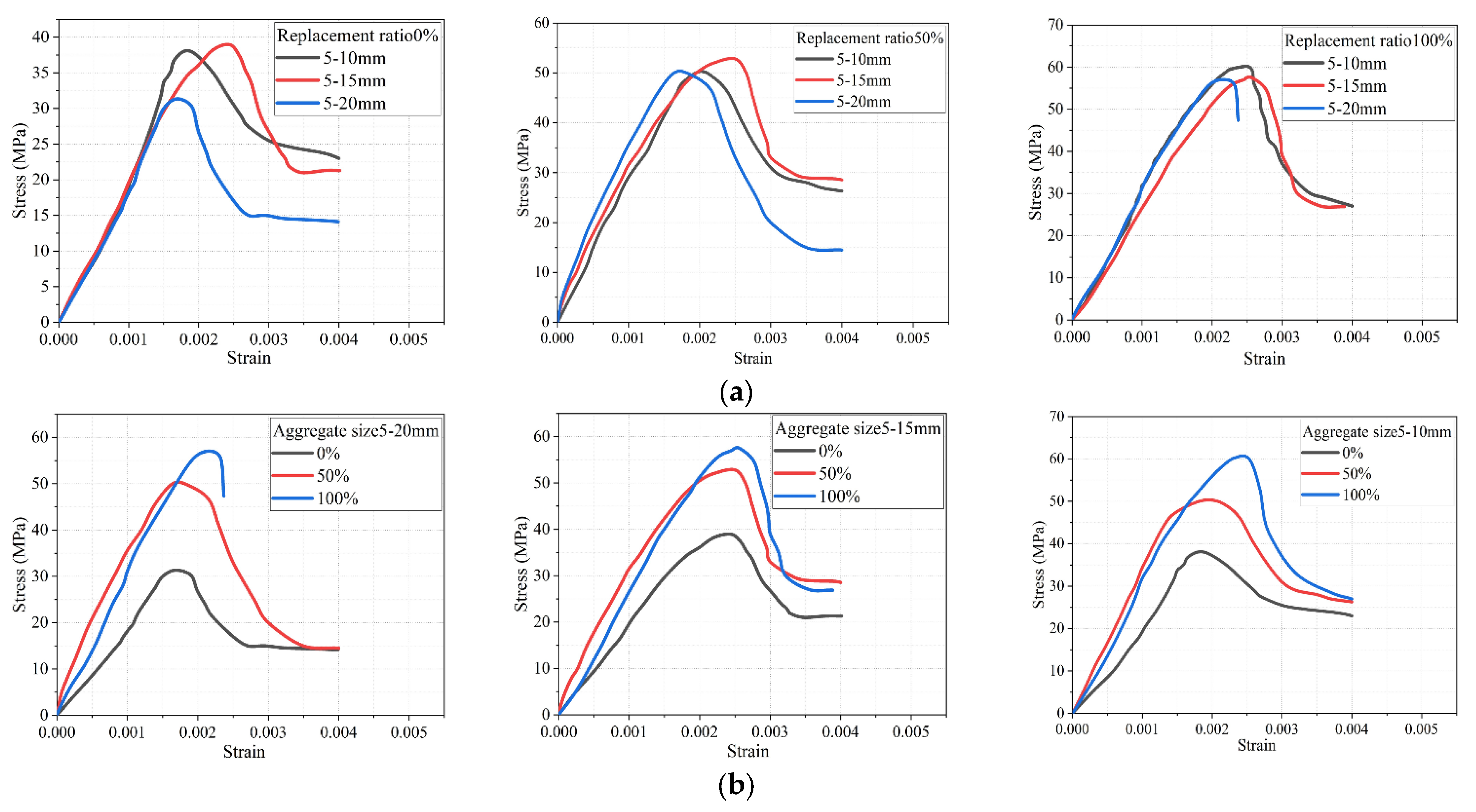 3.1.2. Comparative Analysis of Stress–Strain Curves Under Different Aggregate Size Ranges and Replacement Ratios