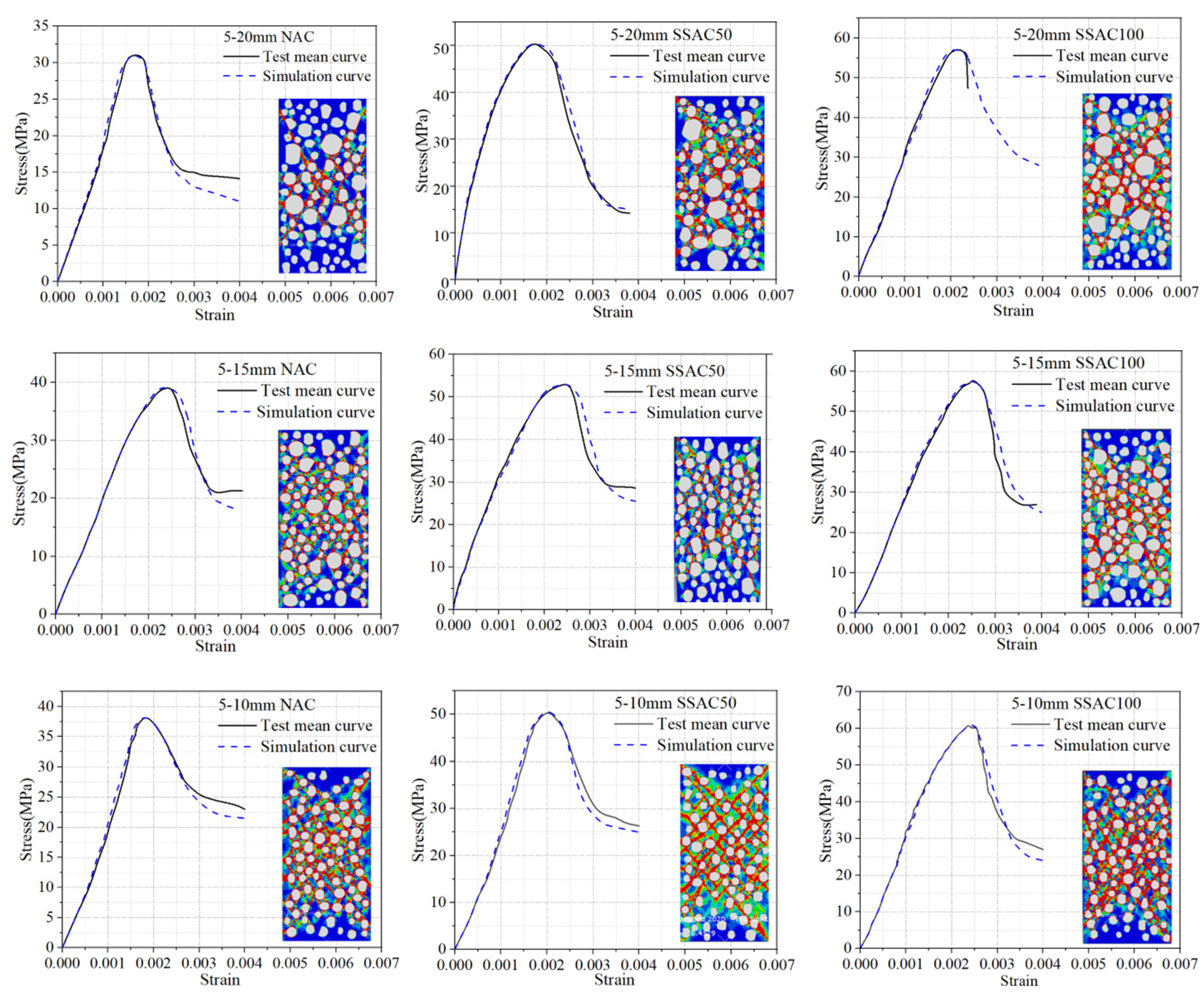 - Mesoscale numerical simulation results indicate that as the cohesive strength of the ITZ around SSA is increased relative to NA by 75% (5–20 mm), 106% (5–15 mm), and 92% (5–10 mm), the simulated stress–strain curves are in good agreement with the experimental results. The validated model and parameters can serve as a reference for structural simulations of SSAC under different service conditions.