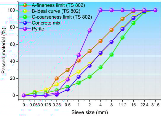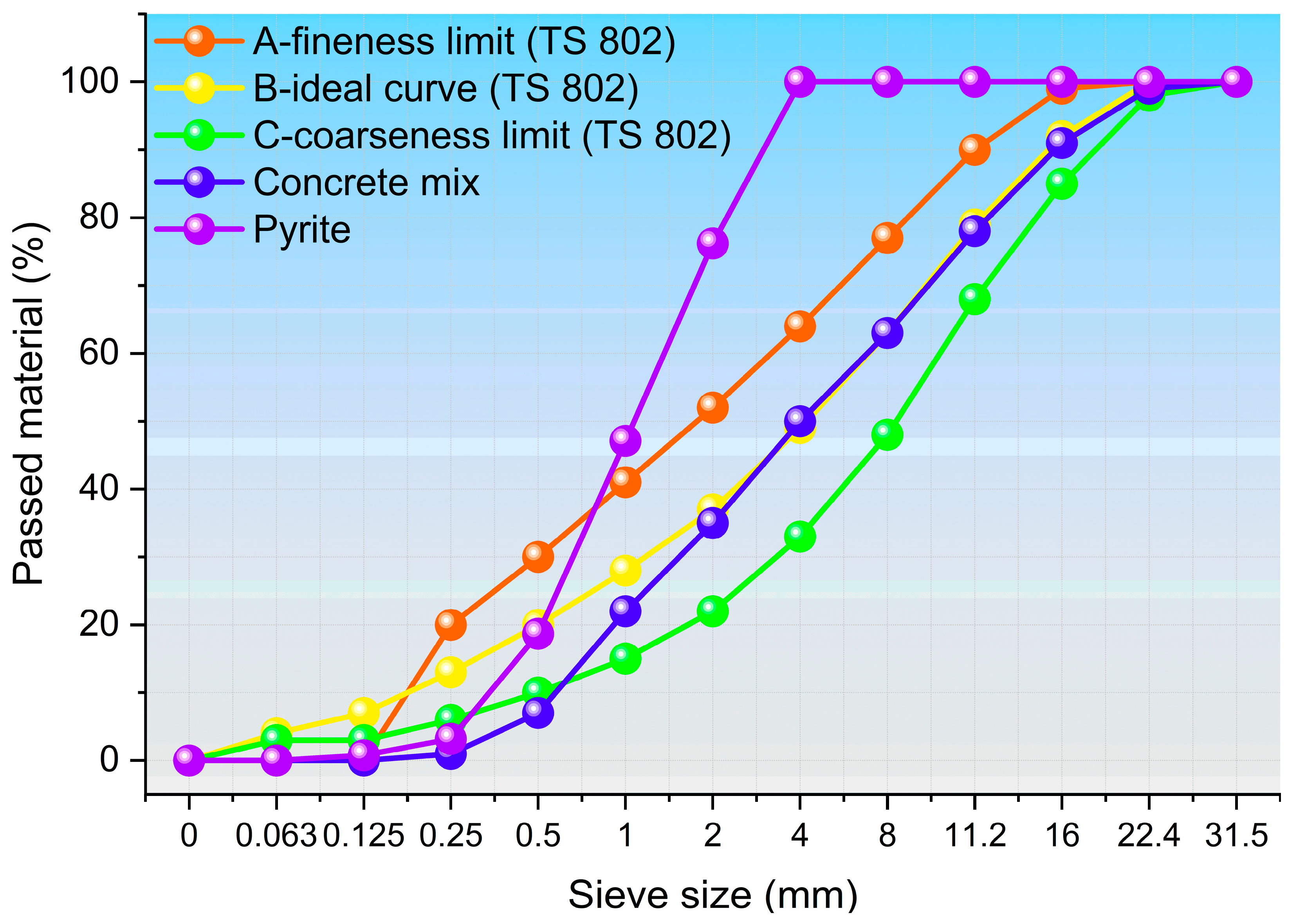 CEM I 42.5 R-type cement was used in the study and aggregates and admixtures were obtained from a concrete plant in Rize province. Pyrite rocks, which are the basic material of the study, were taken from a copper mine, processed in a jaw crusher, and sieved through a 4 mm mesh-opening sieve to obtain pyrite fine aggregate. The obtained pyrite material was pulverized in a ball mill in the laboratory environment. Sand (0/4), crushed sand (0/4), coarse aggregate (4/16), coarse aggregate (16/32), and fine aggregate with pyrite (0/4) had specific gravity values of 2.31, 2.48, 2.62, 2.69, and 4.74, respectively [38]. The quantities of the materials used in the concrete mixtures are presented in Table 1, and a granulometric distribution curve showing the conformity of the aggregate mixture with TS 802 (2016) standards is presented in Figure 1 [39].