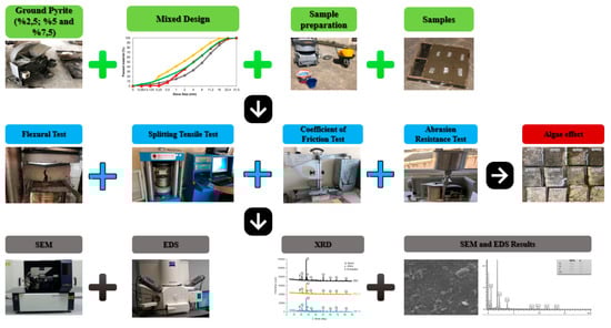 As urban populations grow, the need for communal spaces such as roadways, parks, and gardens rises, leading to a frequent prevalence of concrete applications in these social places [1,2,3]. Concrete is a preferred construction material in field pavements thanks to its advantages, such as creating a high-strength surface, covering large and wide areas quickly and economically, and providing long-term use with the right materials and workmanship [4,5,6]. Although it is a durable material, concrete surfaces are exposed to surface abrasion due to the use of vehicles and pedestrians in some cases, deterioration mechanisms due to the freeze–thaw effect of air, deterioration mechanisms such as algal growth on the surface, especially in humid environments, and damage caused by the crystallization of salt solutions in the porous structure of concrete [7,8,9,10]. Over time, polishing and algal growth on concrete surfaces due to the effects of physical, chemical, and biological factors can cause injuries and fatalities to people or vehicles using this area as the surface becomes very slippery [11,12]. Therefore, it is of great importance to understand the socio-economic impacts, causes of, and potential solutions to the damage caused to vehicles and people due to polishing and algal growth on concrete on such sites [13]. Algae, which form over time as a result of physical and chemical reactions within the structure, can expand and contract in response to wetness and drying, forming enormous volumes of slime that can cause the concrete surface to peel. These slime layers can create a slippery surface on site concrete and pose a safety risk [14,15,16,17]. This can have a large impact, especially when large quantities of field concrete are involved. This is because these structural components, which have mass concrete properties, can be further compromised due to biological layers forming on their surface or moisture-related deterioration. Therefore, to maintain performance in mass concrete applications, it is necessary to manage the algal growth and slime deposits on the surface. Mass concrete is defined as a monolithic structural element with dimensions that require the management of thermo-mechanical stresses and the associated volumetric deformations resulting from the exothermic reactions of cement hydration [18]. Field concrete, which is a mass concrete, has a wide range of applications and is used in pavements, industrial floors, marine environments, airports, and many other places where large volumes of concrete are required [19,20,21]. The long-term performance of such concretes may vary depending on many parameters such as exposure to environmental factors, loading conditions, and maintenance processes. In the design of mass concretes, techniques such as low-temperature cement types, appropriate mix proportions and cooling systems are used for crack control and minimization of internal stresses [22,23,24,25,26]. The techniques mentioned require a comprehensive evaluation of mineralogical elements that may affect the internal structure of concrete. This is because the hydration process, heat formation, and service performance can be affected by the physical and chemical properties of minerals added to the mixture or directly present in the aggregate. Therefore, the performance of mass concrete is particularly shaped by the minerals it contains, and these minerals must be thoroughly investigated.