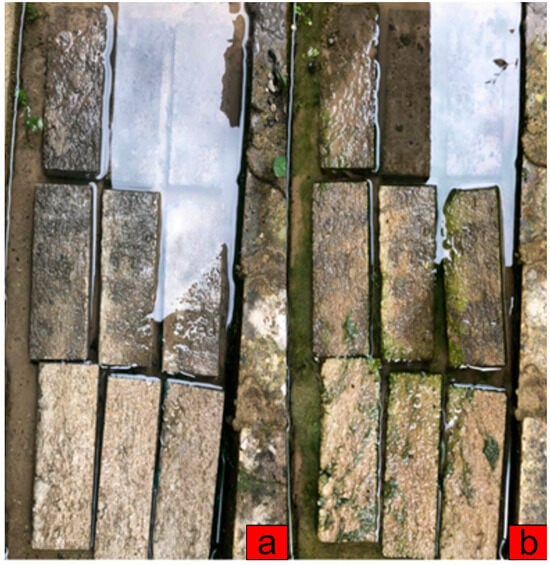 Figure 7. Samples with pyrite substitutions at rates of 0 kg/m2, 1 kg/m2, and 3 kg/m2 (50 × 80 × 200): (a) samples exposed to clean water for 2 months; (b) samples exposed to dirty water for 2 months.
