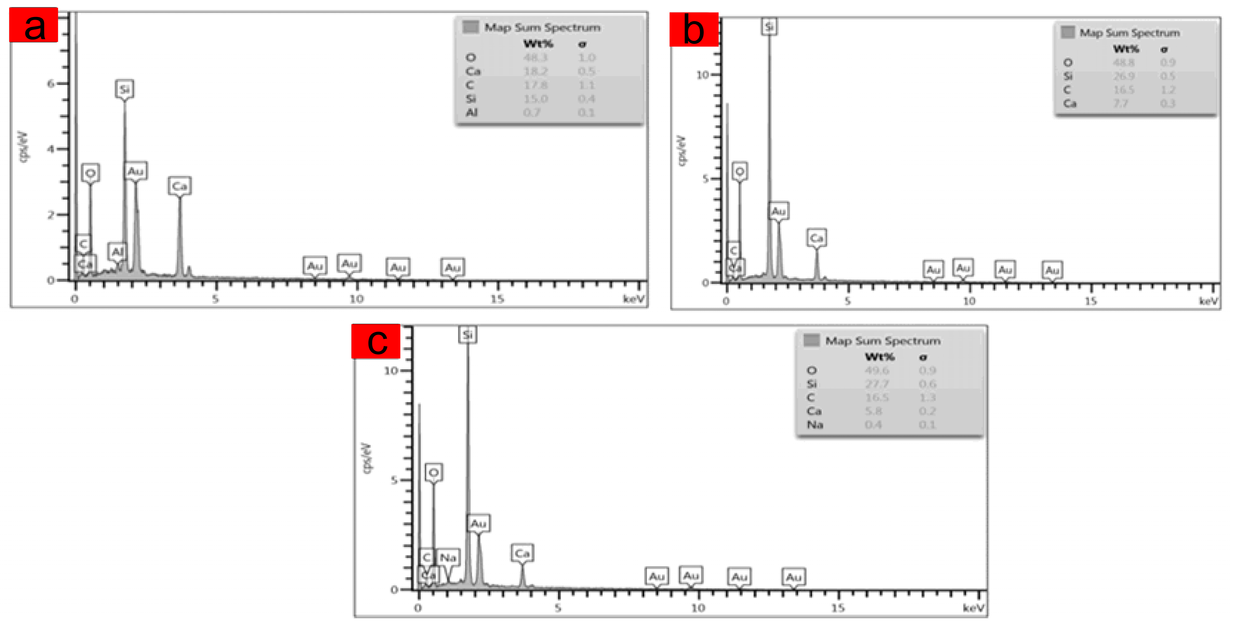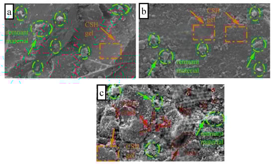 Figure 8 presents the 1000× magnified images obtained from SEM analyses. Figure 8a demonstrates a C-S-H structure and a low proportion of unreacted parts on the surface of the control sample. Figure 8b shows that a large number of particles did not fully associate with the C-S-H structure. Also, Figure 8c highlights the structure is porous and reveals the presence of microcracks on the surface of the PB7.5 sample [49].