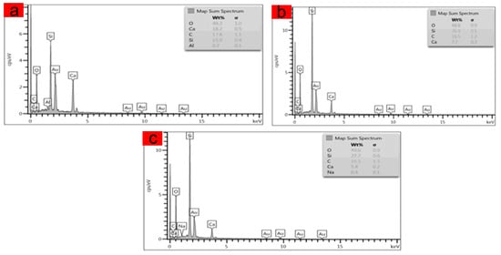 Figure 9. EDS graph of (a) PB0, (b) PB2.5, and (c) PB7.5 (80 × 100 × 200) samples.