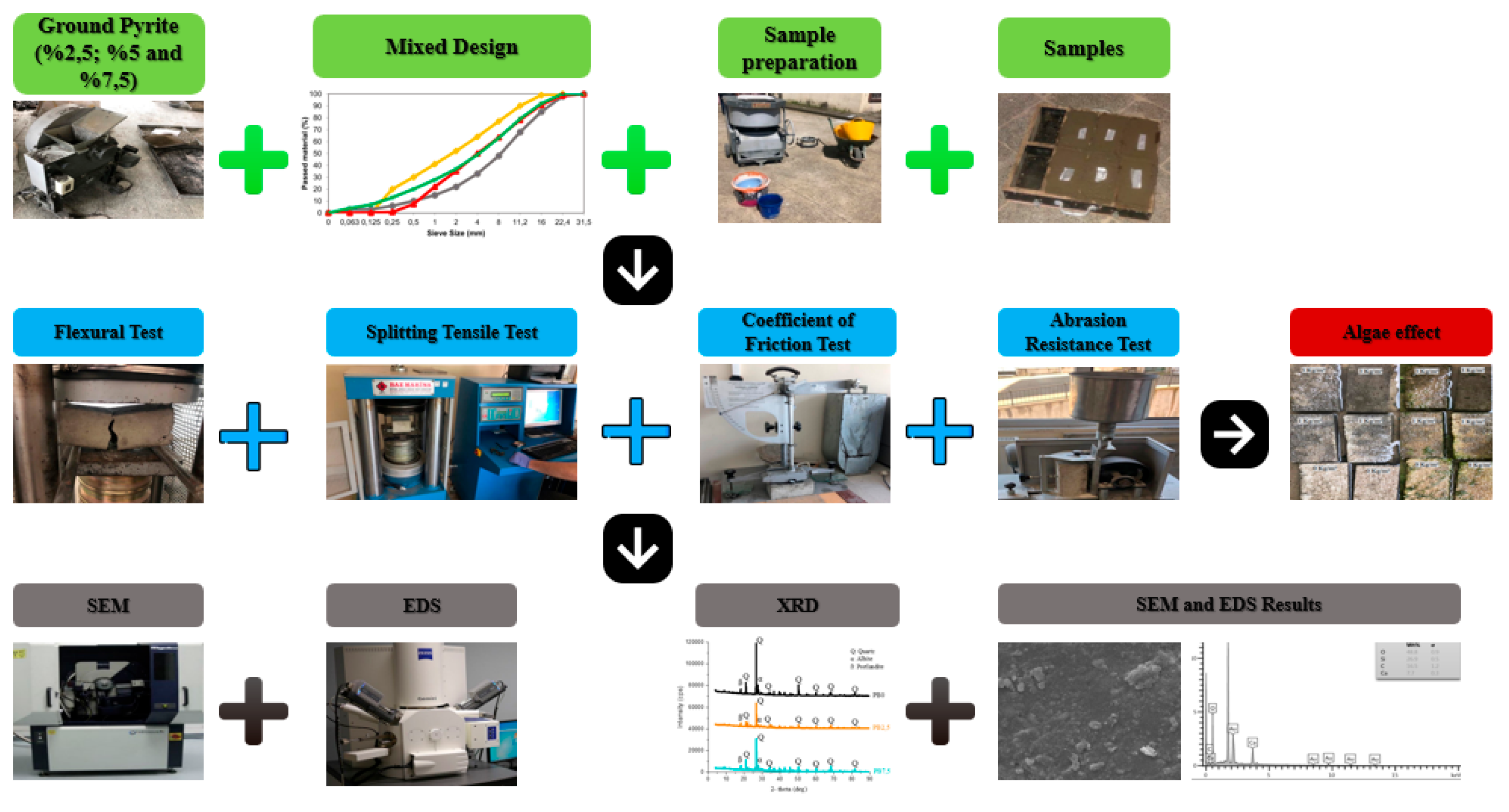 The results of this study indicate that pyrite can positively improve physical parameters such as mechanical strength and surface abrasion resistance in field concretes. The increasing population and the increasing number of people living in cities have increased the need for infrastructure work on surface concretes in shared-use areas such as parks and recreational areas, and it is anticipated that this will further increase in the future. Therefore, improving the mechanical properties of the materials used in such areas to benefit the circular economy and increasing their resistance to the physical deterioration, such as moss growth, that may occur during long-term use is essential for a sustainable future. This study addresses a knowledge gap in the literature, provides data that can form the basis for future studies, and aims to provide insights into the use of limited raw materials for social benefit.
