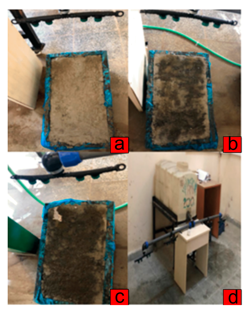 Figure 3. 50 × 240 × 500 mm specimens: (a) mass concrete; (b) 1 kg/m2 pyrite-treated specimen; (c) 3 kg/m2 pyrite-treated specimen; (d) test setup.