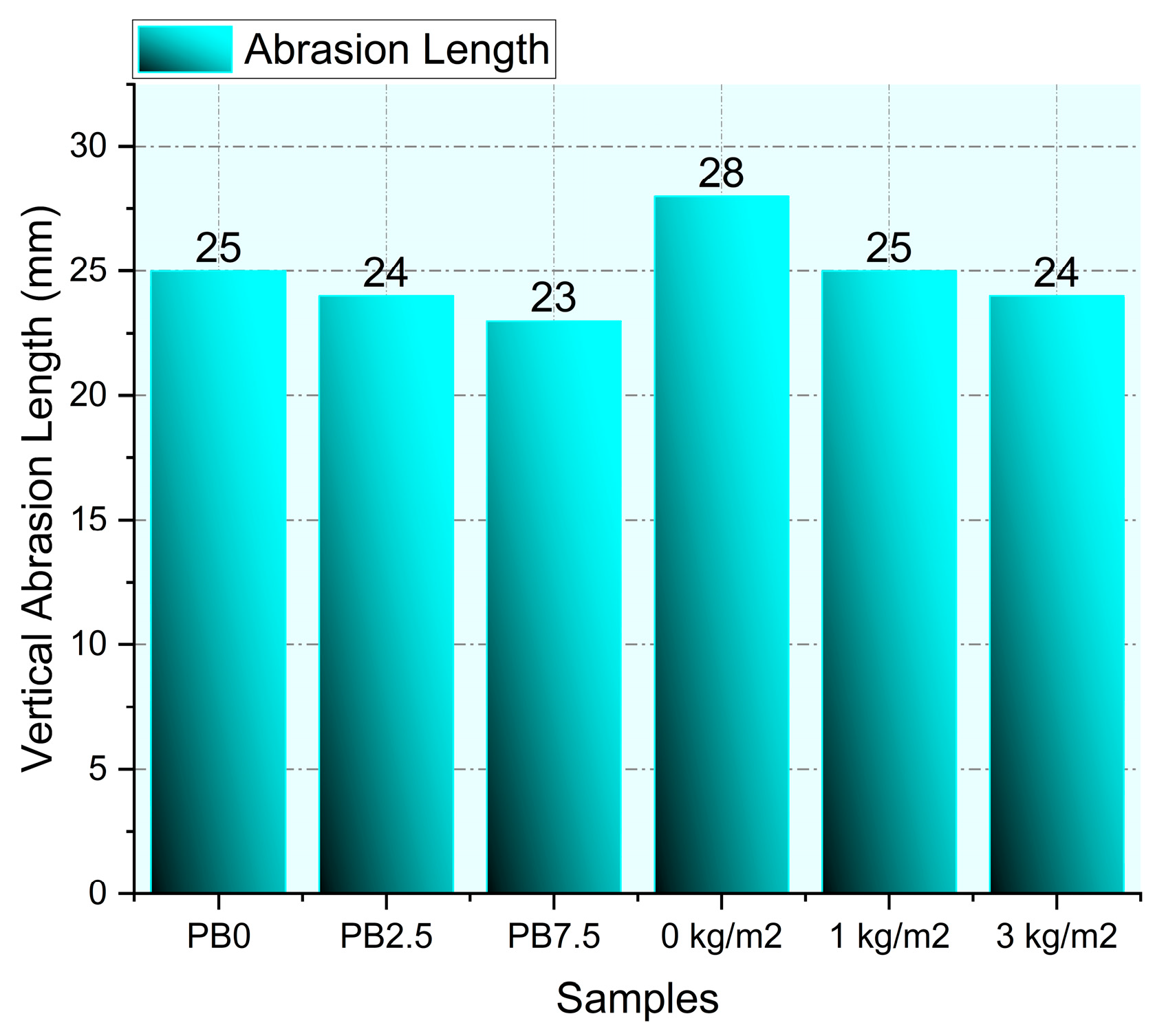 Figure 5. Vertical abrasion lengths of PB0, PB2.5, and PB7.5 specimens and 0 kg/m2, 1 kg/m2, and 3 kg/m2 (50 × 80 × 200 mm3) specimens.