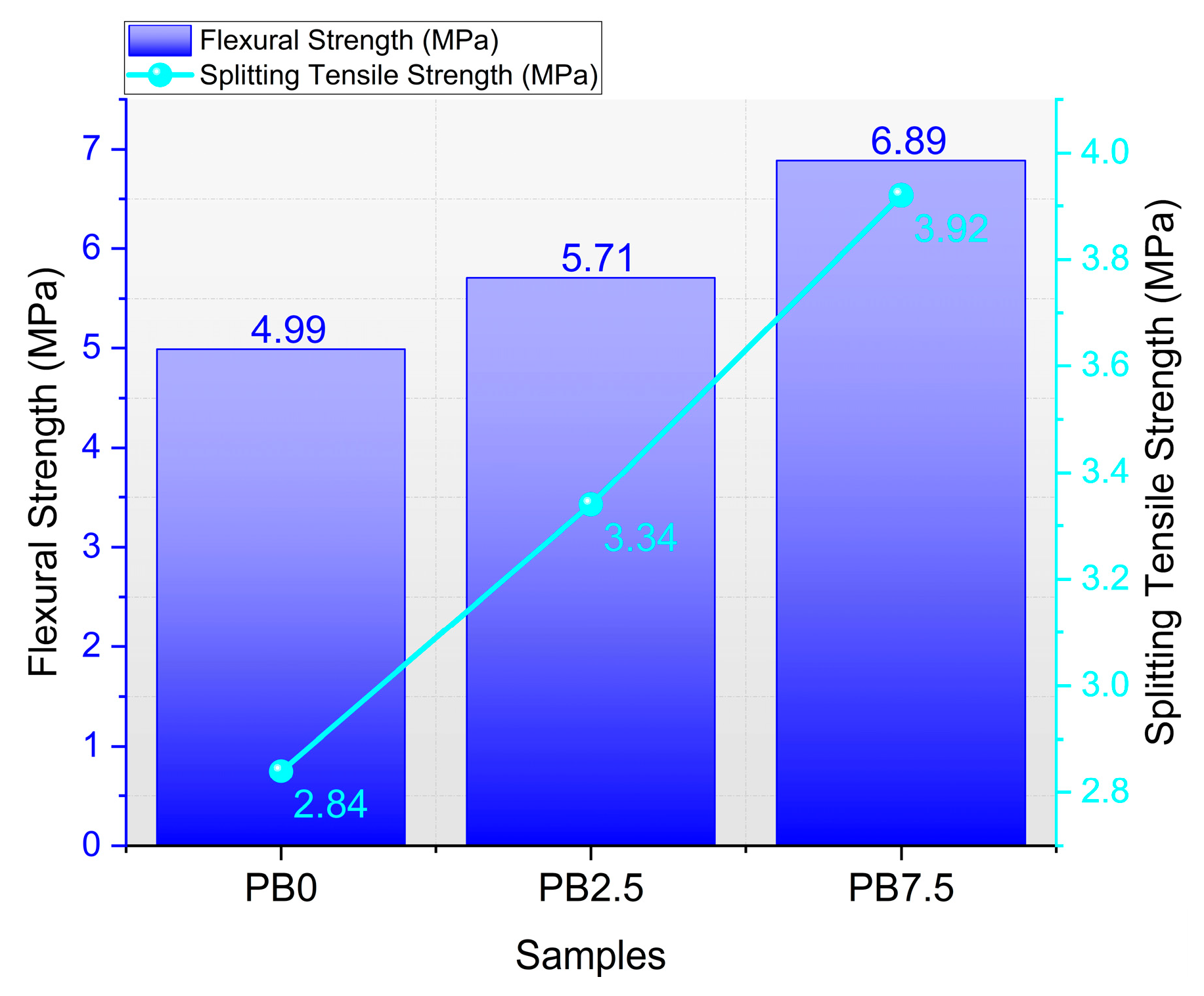 Table 2. Flexural and splitting tensile strengths of PB0, PB2.5, and PB7.5 specimens.