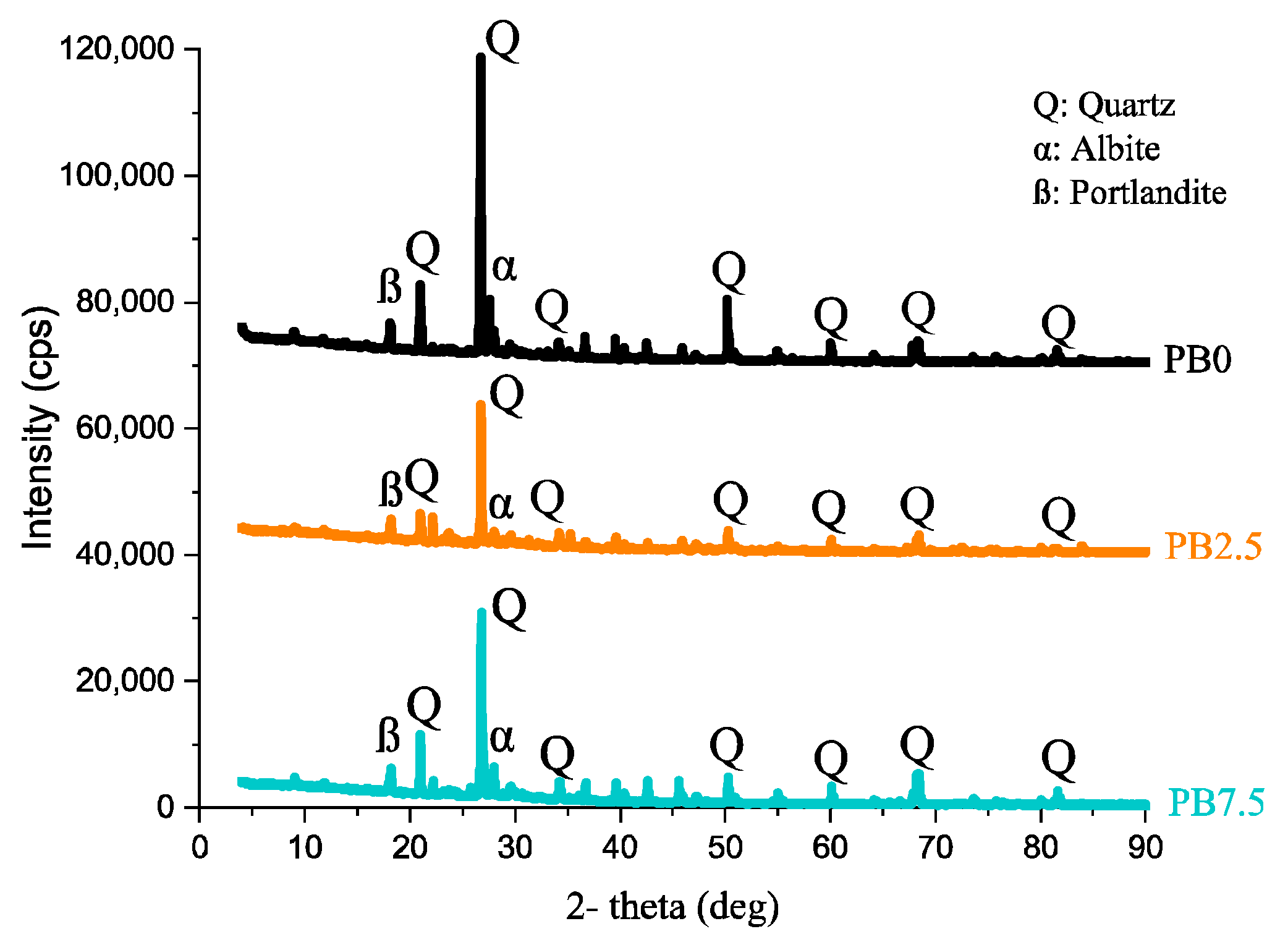 XRD analysis revealed portlandite peaks, and a decrease in SiO2 peaks in the XRD pattern was observed with pyrite substitution. Additionally, EDS analysis showed a significant increase in the Si element in the PB2.5 and PB7.5 samples. This could be attributed to the C-S-H gel formed by the secondary filling effect. Furthermore, XRD analysis revealed albite peaks. Albite peaks, with the chemical formula NaAlSi3O8, decrease in the XRD pattern as pyrite substitution increases. This situation could also be related to the results of the EDS analysis, which shows that the control sample contains Al but this is not present in the elemental composition with pyrite substitution [56,57].