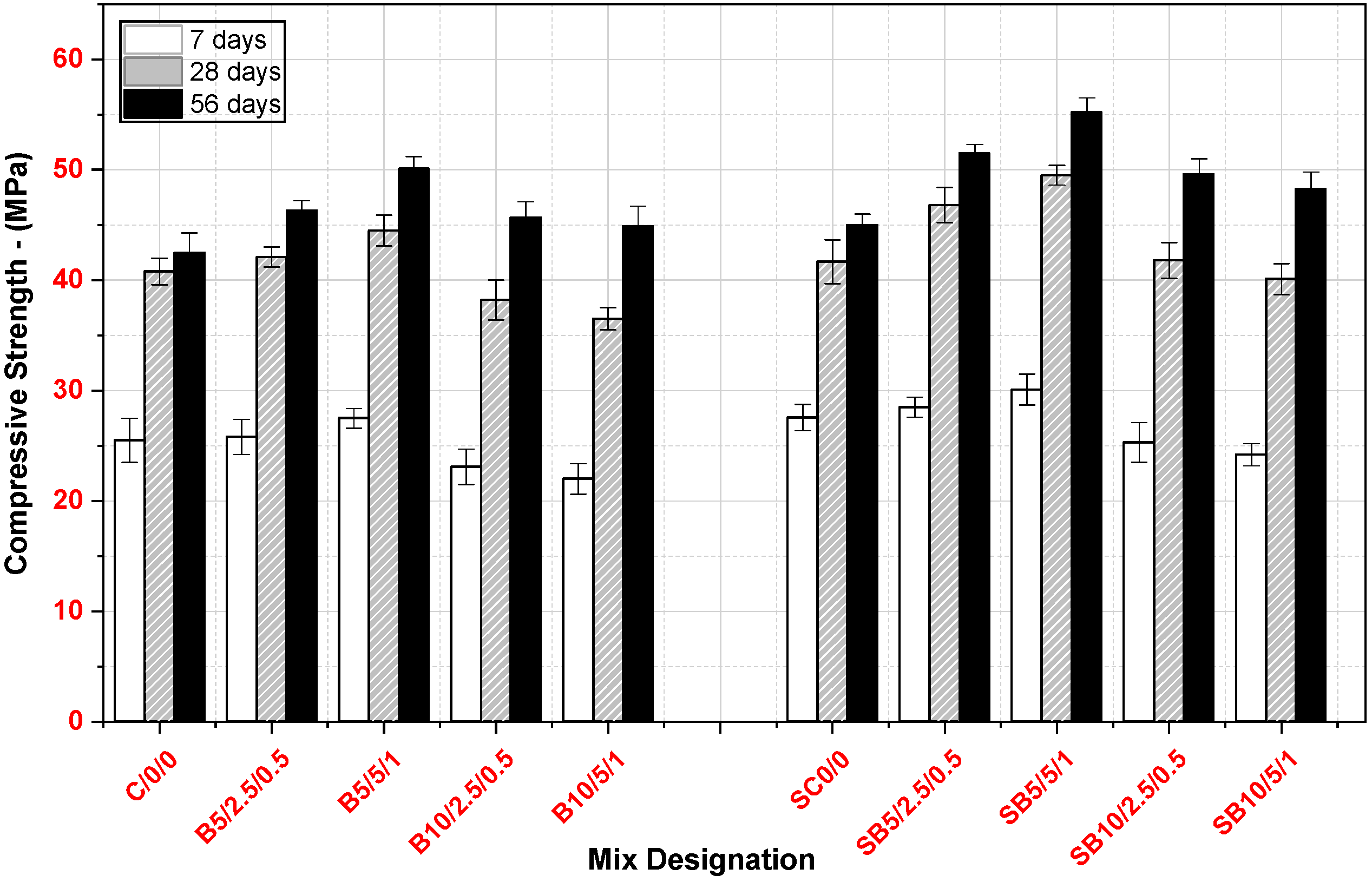 - Related to synergistic enhancement of tensile performance, both bacteria and sisal fibers individually improved tensile strength; however, their combination produced a significant synergistic effect. Mix SB10/5/1 consistently achieved the highest splitting tensile strengths at all ages, reaching 6.3 MPa at 56 days, highlighting the mutual enhancement between fiber bridging and bacterial calcite precipitation.